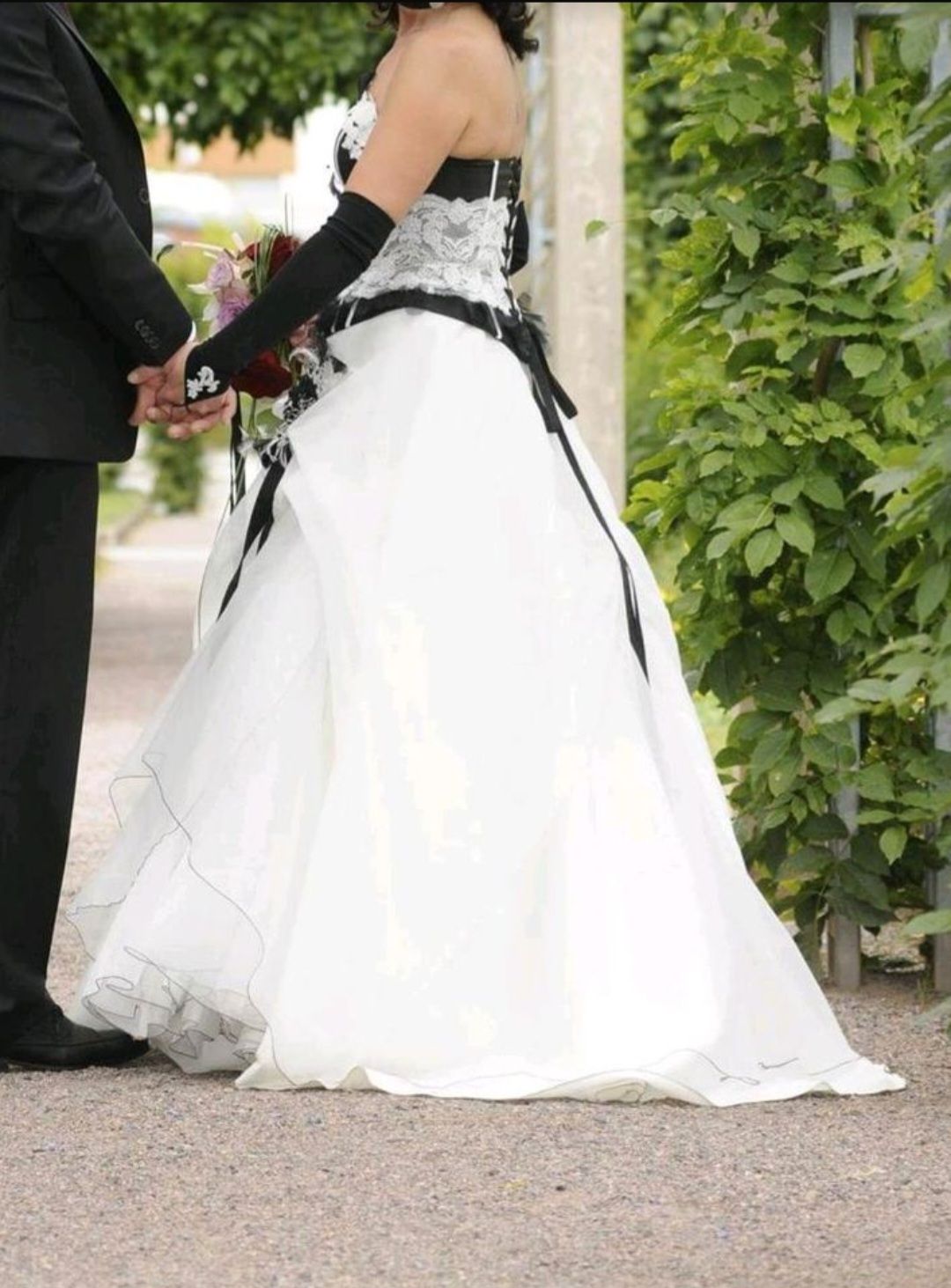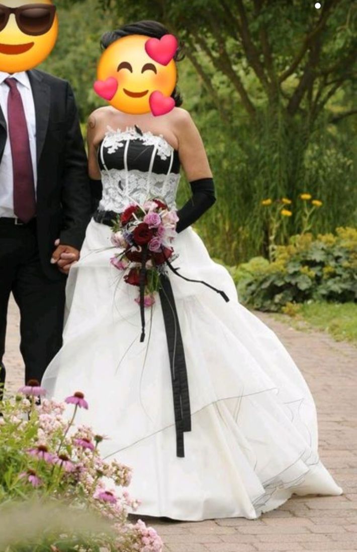 ch verkaufe schweren Herzens mein wunderschönes, außergewöhnliches Brautkleid. Es ist ein echter Hingucker für alle Bräute, die keinen klassischen „All-White-Look“ suchen, sondern Akzente setzen wollen (perfekt auch für Gothic, Rockabilly oder Vintage-Styles!).