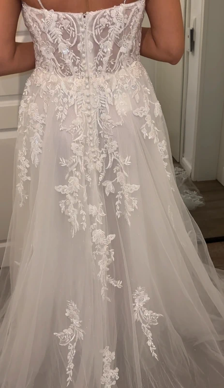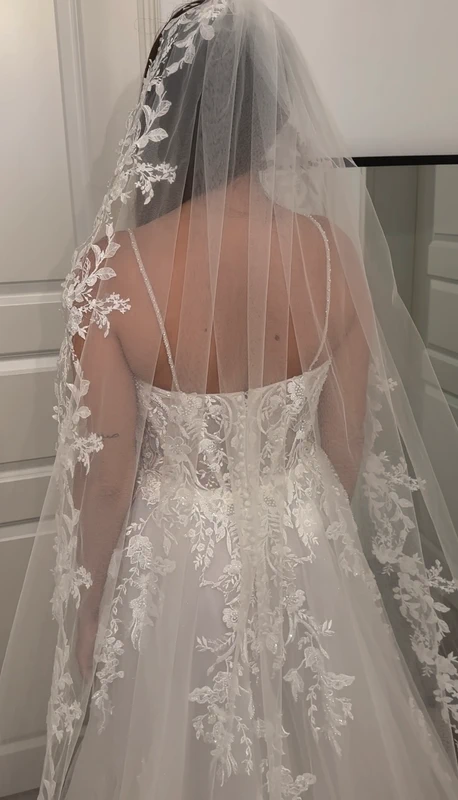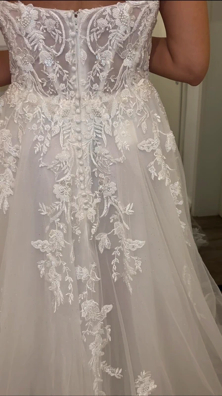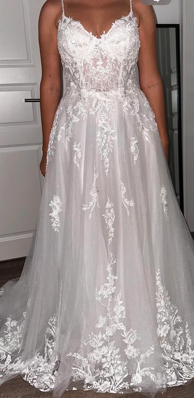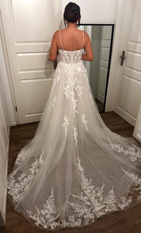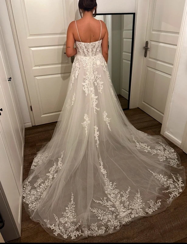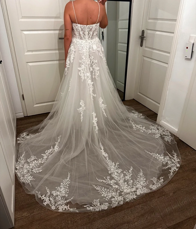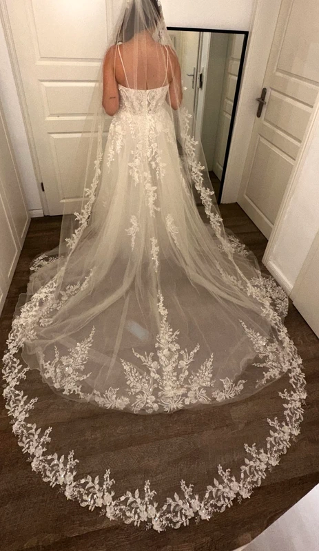 Ich verkaufe schweren Herzens mein ungetragenes A-Linie Brautkleid! Passender 3 meter langer Schleier mit Kamm dazu. Alle Details können aus den Bildern entnommen werden. Das Kleid wurde auf Größe 36/38 abgeändert. Ich bin 1,64 groß und trage auf den Bildern High-Heels mit 8 cm Absatzhöhe! Brustgröße B. Rechnung vorhanden- Farbe Ivory Neupreis Kleid 2500€ Neupreis Schleier 300€ Bitte nur seriöse Anfragen, ich kann euch auch per WhatsApp oder Instagram Videos schicken, wenn gewünscht. Anprobe auch möglich.