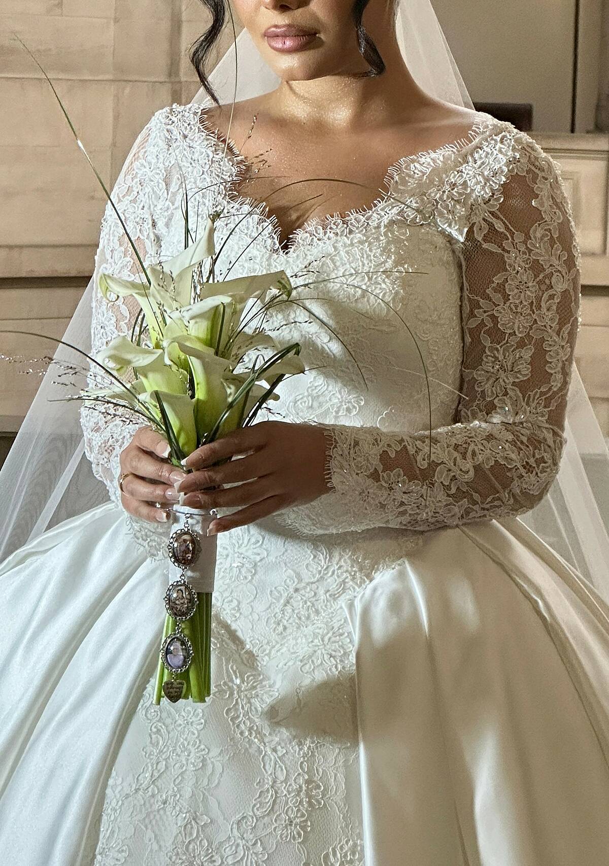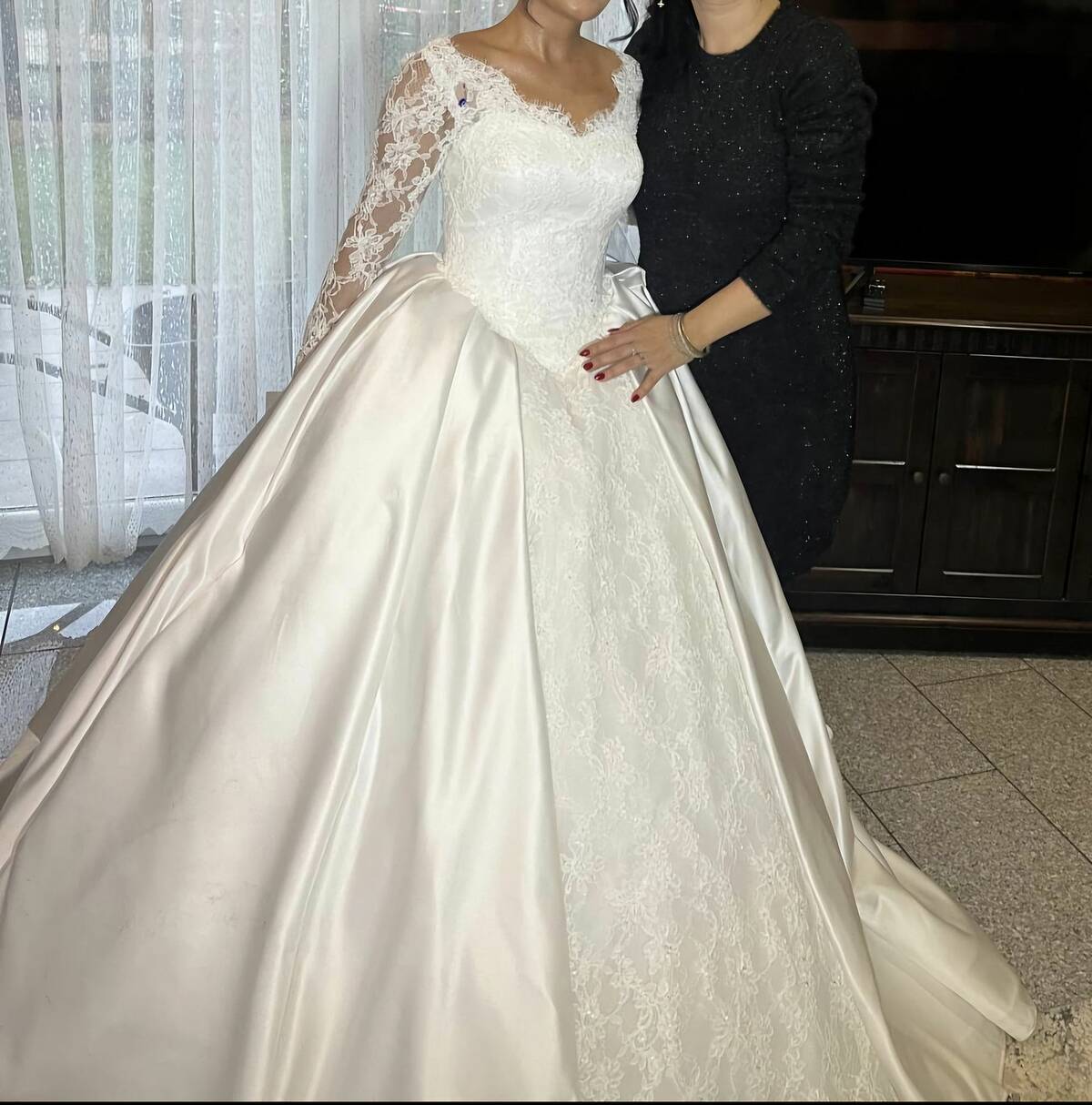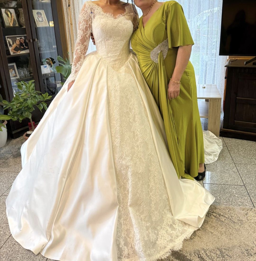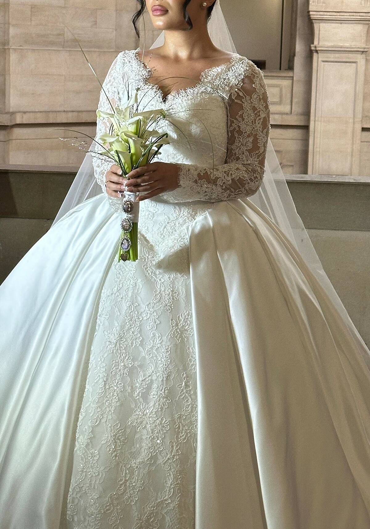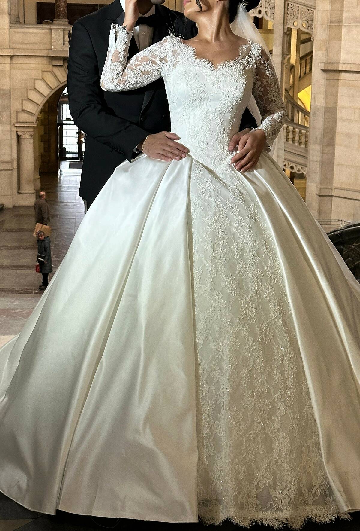 Ich verkaufe mein wunderschones Brautkleid im zeitlosen Ballkleid-Stil.Es ist eine absolute Traumrobe, die sich durch die hochwertige Kombination aus filigraner Spitze und edlem Satin auszeichnet Highlights des Kleides: Oberteil: Wunderschöne, florale Spitze mit dezenten Pailletten (leichter Schimmer) Ausschnitt: Eleganter V-Ausschnitt mit feiner Spitzenkante Ärmel: Lange, transparente Spitzenärmel sehr edel und perfekt für jede Jahreszeit. Rock: Voluminöser, schwerer Satinrock mit einer zentralen Bahn aus Spitze, die das Design des Oberteils perfekt aufgreift
