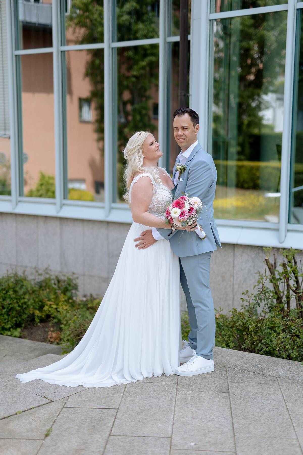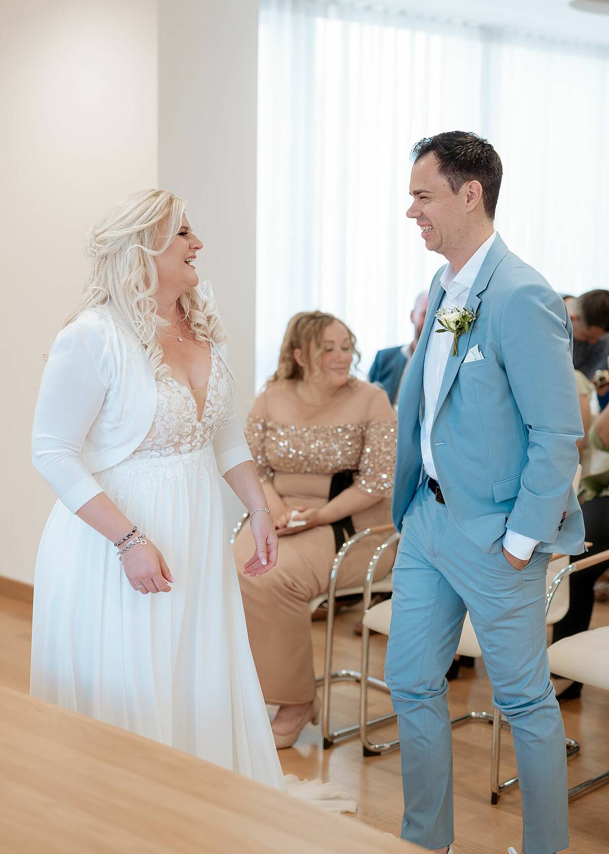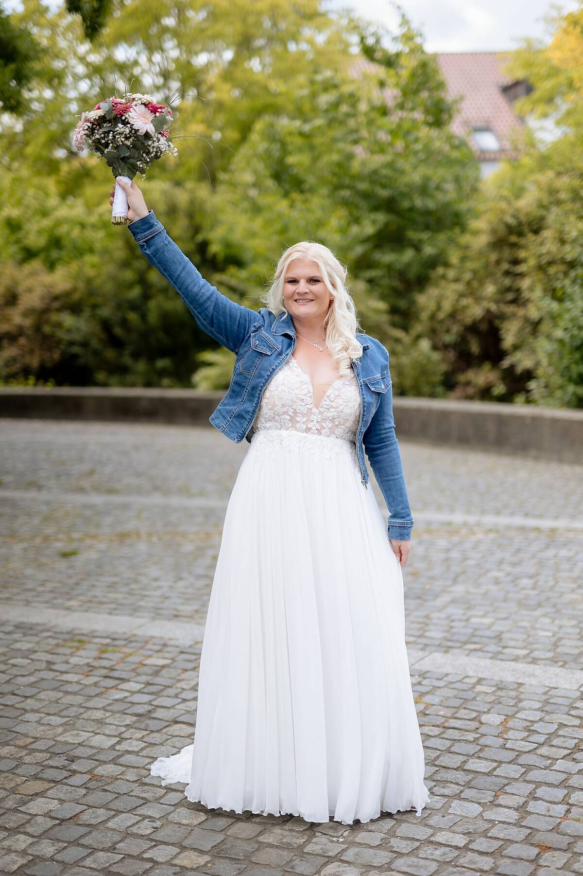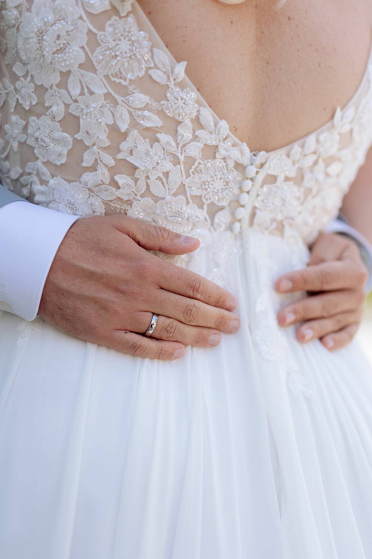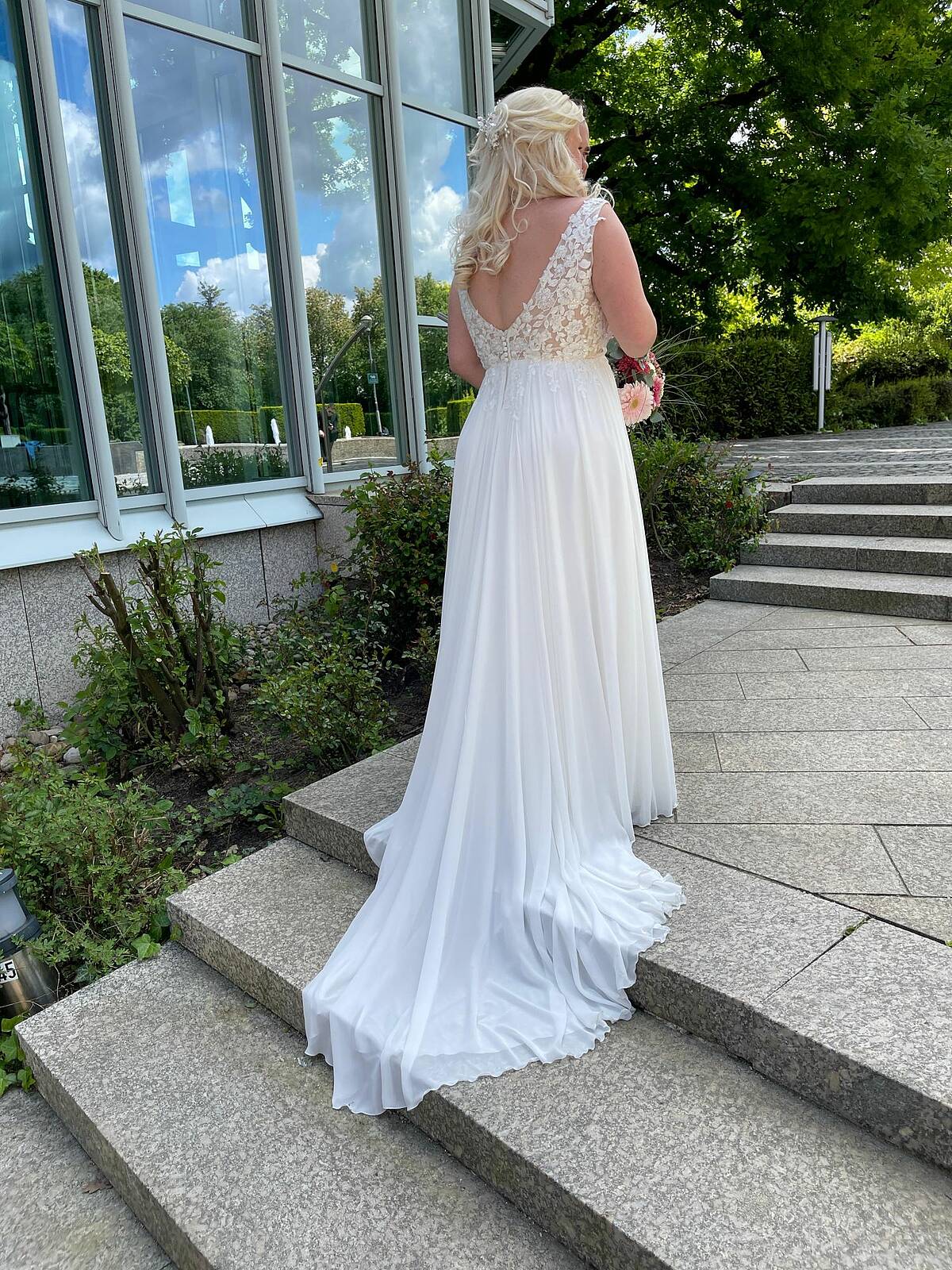 • Elegante A-Linie in der Farbe Ivory mit Blütenspitze • V-Ausschnitt vorne und hinten • Rückenausschnitt mit Reißverschluss und Knöpfen • Professionell angepasst: gekürzte Schleppe, schmalere Träger, breitere Cups • Schleppe kann hochgebunden werden ohne aufzutragen Größe 44 mit den Maßen: Brust 108cm, Taille 85cm, Bauch 100cm. Für eine Körpergröße von 167cm mit 5cm Absatz perfekt angepasst.( Gesamtlänge bei 172cm) Das Kleid wurde professionell gereinigt und ist in einwandfreiem Zustand ohne jegliche Mängel.