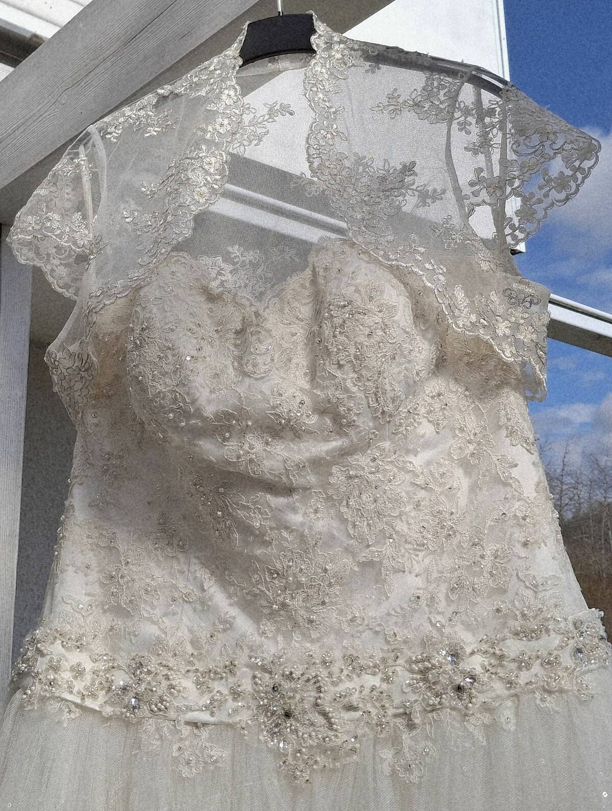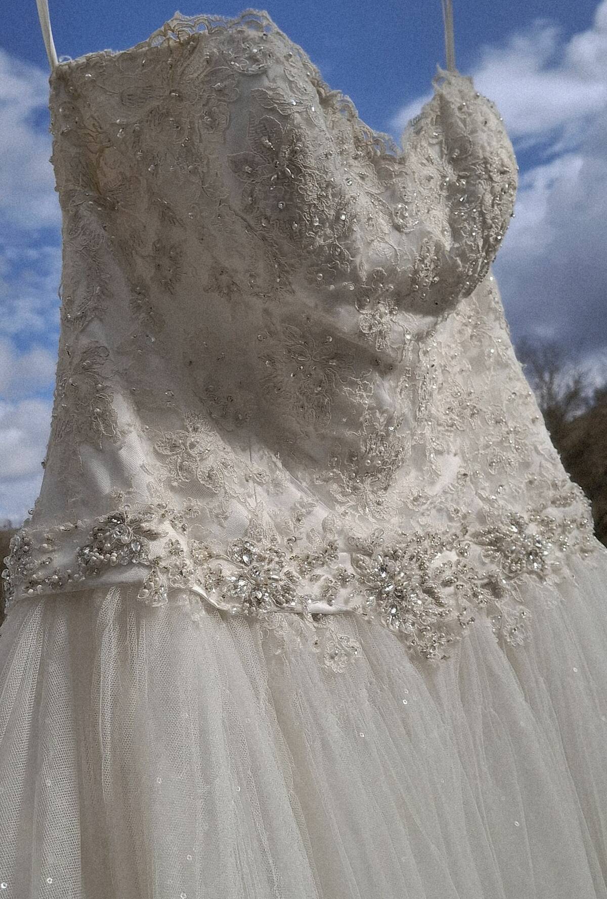 Wunderschönes Brautkleid mit Spitze und Perlenstickerei – inkl. Bolero Ich verkaufe mein elegantes Brautkleid in einem klassischen Ivory/Champagner-Ton. Das Kleid hat ein trägerloses Corsagen-Oberteil mit aufwendiger Spitze und liebevollen Perlen- sowie Glasperlenstickereien. Die Corsage formt eine schöne Silhouette und ist hochwertig verarbeitet. Der Rock fällt locker und romantisch aus mehreren Lagen Tüll und sorgt für einen leichten, fließenden Look. Besonders schön sind die feinen Glitzereffekte im Stoff, die im Licht dezent funkeln. Dazu gehört ein passender transparenter Bolero aus Tüll mit aufwendiger Spitzenstickerei, der die Schultern leicht bedeckt und perfekt zum Kleid passt. Details: Farbe: Ivory / Champagner Trägerloses Corsagen-Oberteil Aufwendige Spitzen- und Perlenstickerei Mehrlagiger Tüllrock mit leichtem Glitzereffekt Inklusive passendem Spitzen-Bolero Sehr romantischer und zeitloser Stil Das Kleid wurde einmal zur Hochzeit getragen und befindet sich in gutem Zustand.