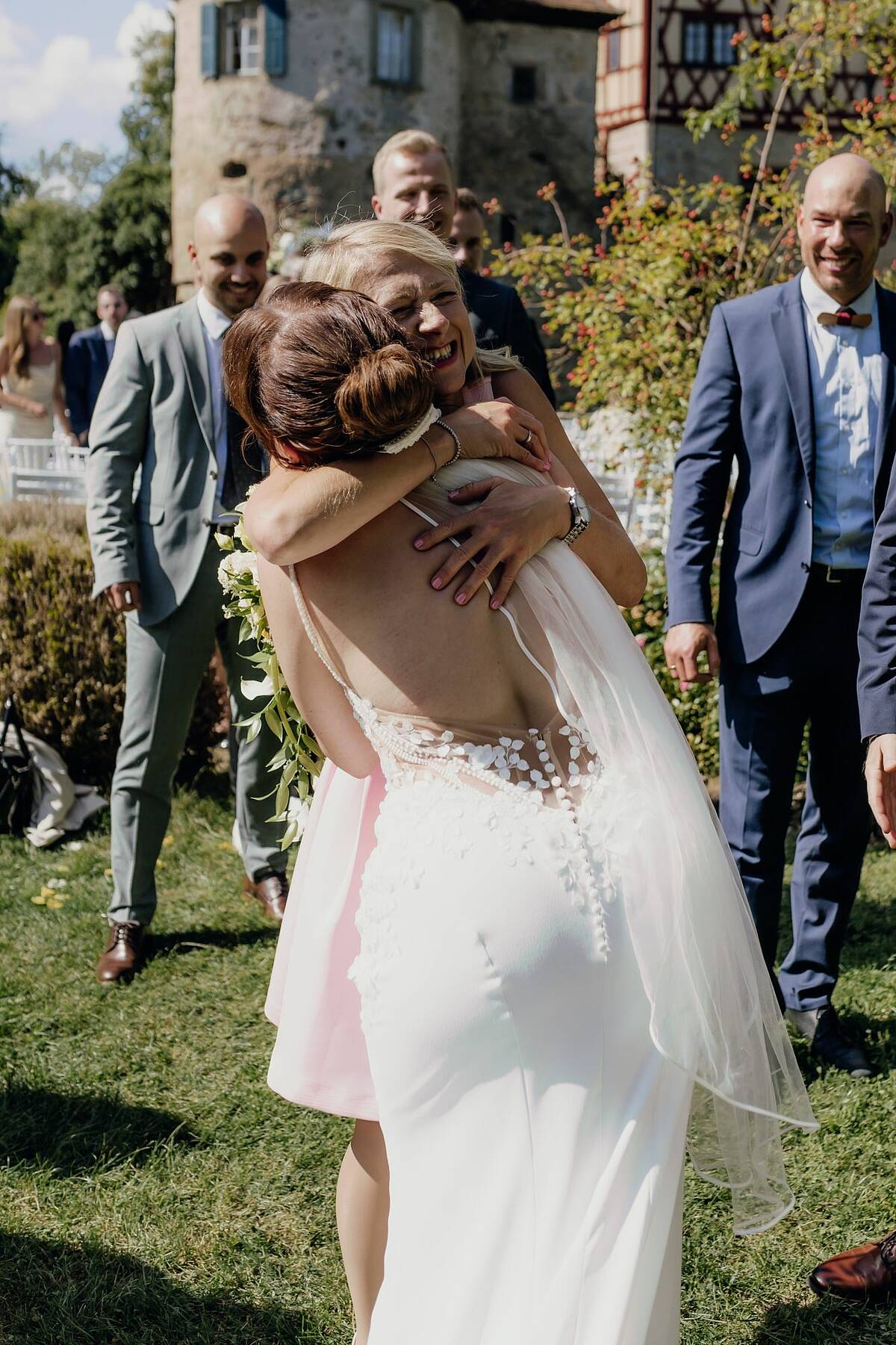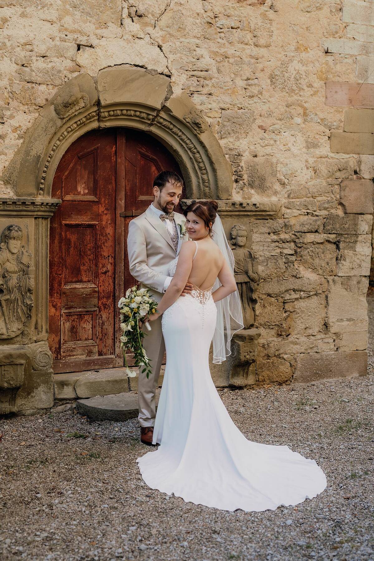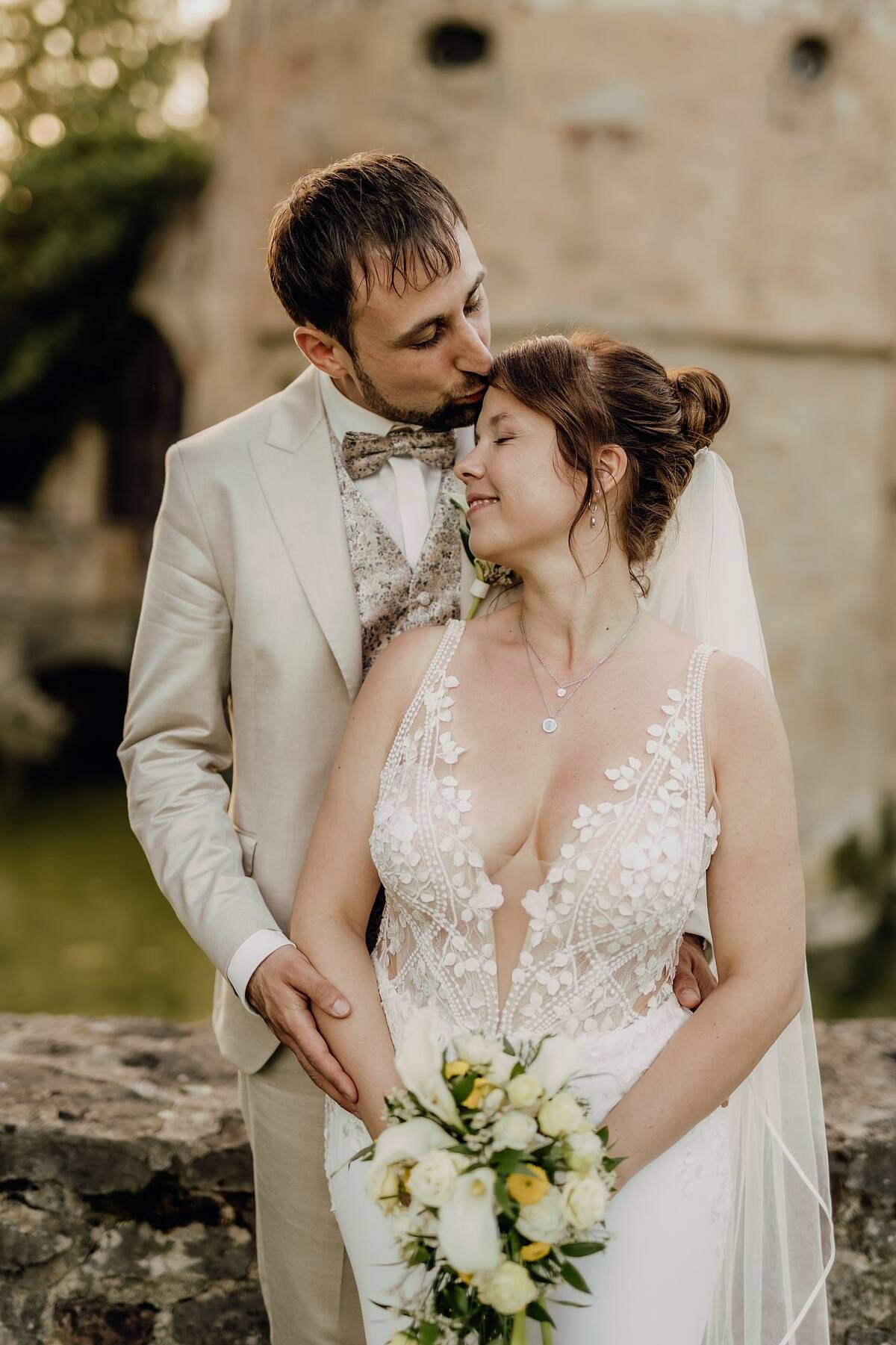Man sieht einfach aus jedem Winkel gut darin aus! Aber fangen wir einfach mal oben an: Das Kleid hat einen tiefen Ausschnitt, der mit wunderschönen kleinen weißen Blättern besetzt ist. Die Spitze ist außerdem durchzogen von kleinen aufgestickten Punkten, die sich auf den nach oben dünn zulaufenden Trägern fortsetzen. Hinten verlaufen die Träger nicht einfach langweilig nach unten sondern seitlich und enden unter der Schulter. Das gibt ihm einen modernen Touch. Die Spitze reicht rundherum bis in den Stoff des Rocks, wobei sie an den Seiten tiefer hineinreicht. Das schmeichelt der Figur und erzeugt einen tollen Übergang zwischen dem Nude-Stoff des Oberteils und dem Elfenbeinfarbenen Stoff des Rocks. Der Rock fließt elegant über die Hüfte und Beine ohne zu spannen und wird dann zur Schleppe hin wieder breiter. Die Schleppe selbst hat ideale Länge/Größe, um Eindruck zu machen (und genau das will man als Braut ja!) Und kann danach bequem über eine kleine Schlaufe hochgesteckt werden oder über eine weitere Schlaufe am untersten Ende raffiniert am kleinen Finger getragen werden. Das Kleid ist sexy, ohne billig zu wirken. Es ist elegant und gleichzeitig so angenehm zu tragen, dass man seinen großen Tag genießen kann und sich auch über viele viele Stunden darin wohl fühlt. Besonders mochte ich, dass ich auch ausreichend Beinfreiheit hatte, um zu tanzen und allein auf die Toilette konnte. Und ich muss es nochmal betonen, weil es mir erst bewusst wurde, nachdem ich die Hochzeitsfotos gesehen habe: ich sah wirklich aus jedem Winkel toll darin aus! Und zwar nicht nur auf den Bildern der Fotografin! Dieses Kleid bringt das Beste an dir zum Vorschein und deinem Bräutigam werden definitiv die Augen herausfallen, wenn er dich damit zum ersten Mal sieht!