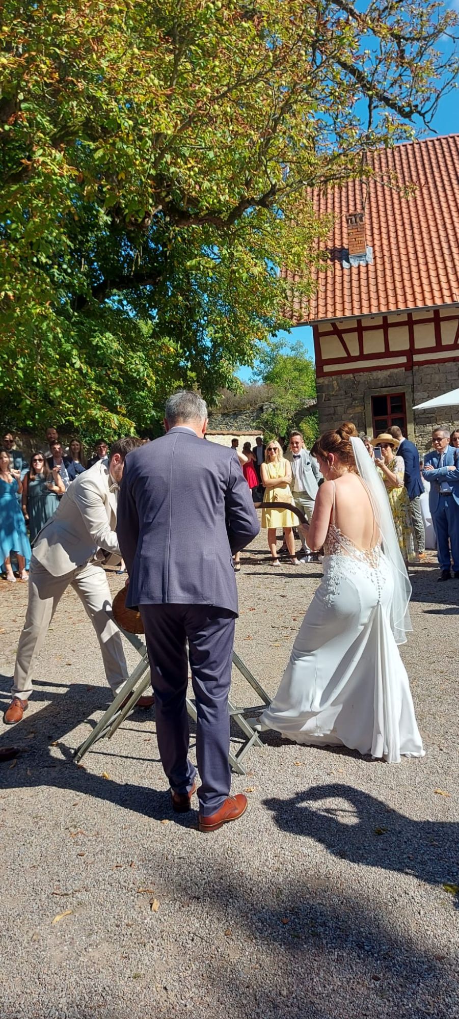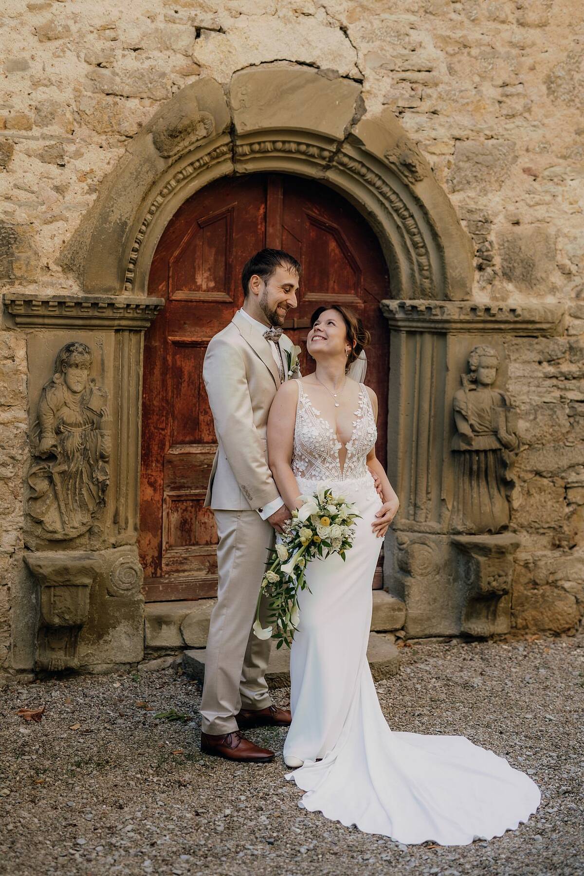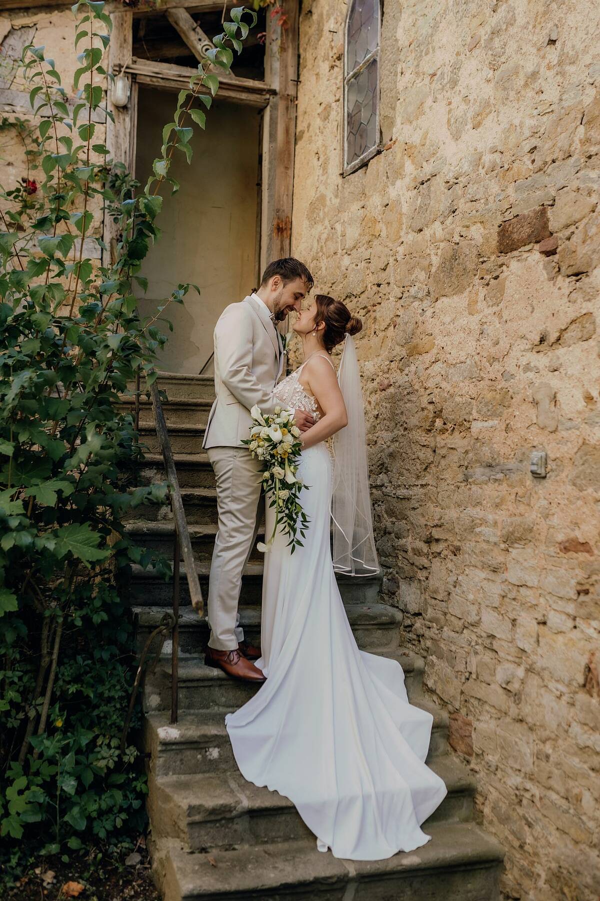 Man sieht einfach aus jedem Winkel gut darin aus! Aber fangen wir einfach mal oben an: Das Kleid hat einen tiefen Ausschnitt, der mit wunderschönen kleinen weißen Blättern besetzt ist. Die Spitze ist außerdem durchzogen von kleinen aufgestickten Punkten, die sich auf den nach oben dünn zulaufenden Trägern fortsetzen. Hinten verlaufen die Träger nicht einfach langweilig nach unten sondern seitlich und enden unter der Schulter. Das gibt ihm einen modernen Touch. Die Spitze reicht rundherum bis in den Stoff des Rocks, wobei sie an den Seiten tiefer hineinreicht. Das schmeichelt der Figur und erzeugt einen tollen Übergang zwischen dem Nude-Stoff des Oberteils und dem Elfenbeinfarbenen Stoff des Rocks. Der Rock fließt elegant über die Hüfte und Beine ohne zu spannen und wird dann zur Schleppe hin wieder breiter. Die Schleppe selbst hat ideale Länge/Größe, um Eindruck zu machen (und genau das will man als Braut ja!) Und kann danach bequem über eine kleine Schlaufe hochgesteckt werden oder über eine weitere Schlaufe am untersten Ende raffiniert am kleinen Finger getragen werden. Das Kleid ist sexy, ohne billig zu wirken. Es ist elegant und gleichzeitig so angenehm zu tragen, dass man seinen großen Tag genießen kann und sich auch über viele viele Stunden darin wohl fühlt. Besonders mochte ich, dass ich auch ausreichend Beinfreiheit hatte, um zu tanzen und allein auf die Toilette konnte. Und ich muss es nochmal betonen, weil es mir erst bewusst wurde, nachdem ich die Hochzeitsfotos gesehen habe: ich sah wirklich aus jedem Winkel toll darin aus! Und zwar nicht nur auf den Bildern der Fotografin! Dieses Kleid bringt das Beste an dir zum Vorschein und deinem Bräutigam werden definitiv die Augen herausfallen, wenn er dich damit zum ersten Mal sieht!