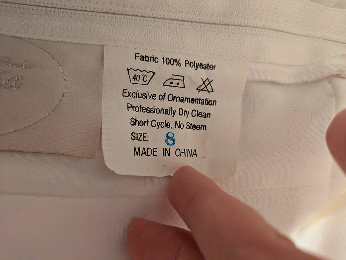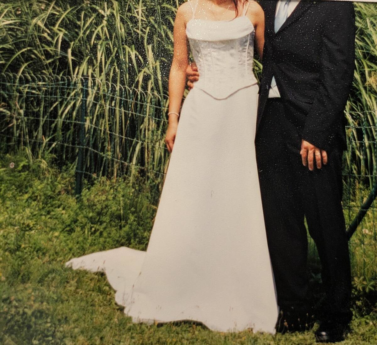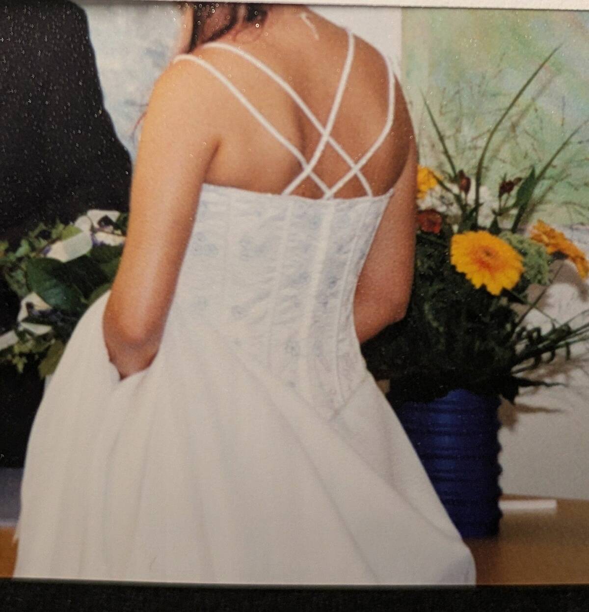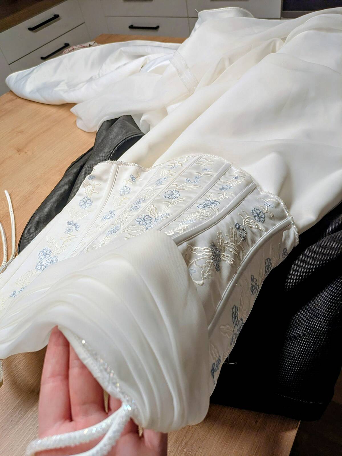 Der obere Teil des Kleides hat eine Corsage mit gestickten weiß-hellblauen Blüten. Die Träger, Rücken-Schnürung, sowie der Absatz der Corsage ist mit weißen schimmernden Perlen besetzt. Der Rockteil hat einen 2 Lagen (einen schweren unteren U einen leichten u feinen Tüll. Dieser wiederholt sich auch auf der Corsage in Brusthöhe. Der Rock hat eine Schleppe, die man am Rock anheften kann. Grundsätzlich könnte man einen ausladenden Unter- od Reifrock dazu tragen. Dieser wurde mir dazu empfohlen. Mir persönlich hat es ohne jedoch besser gefallen.