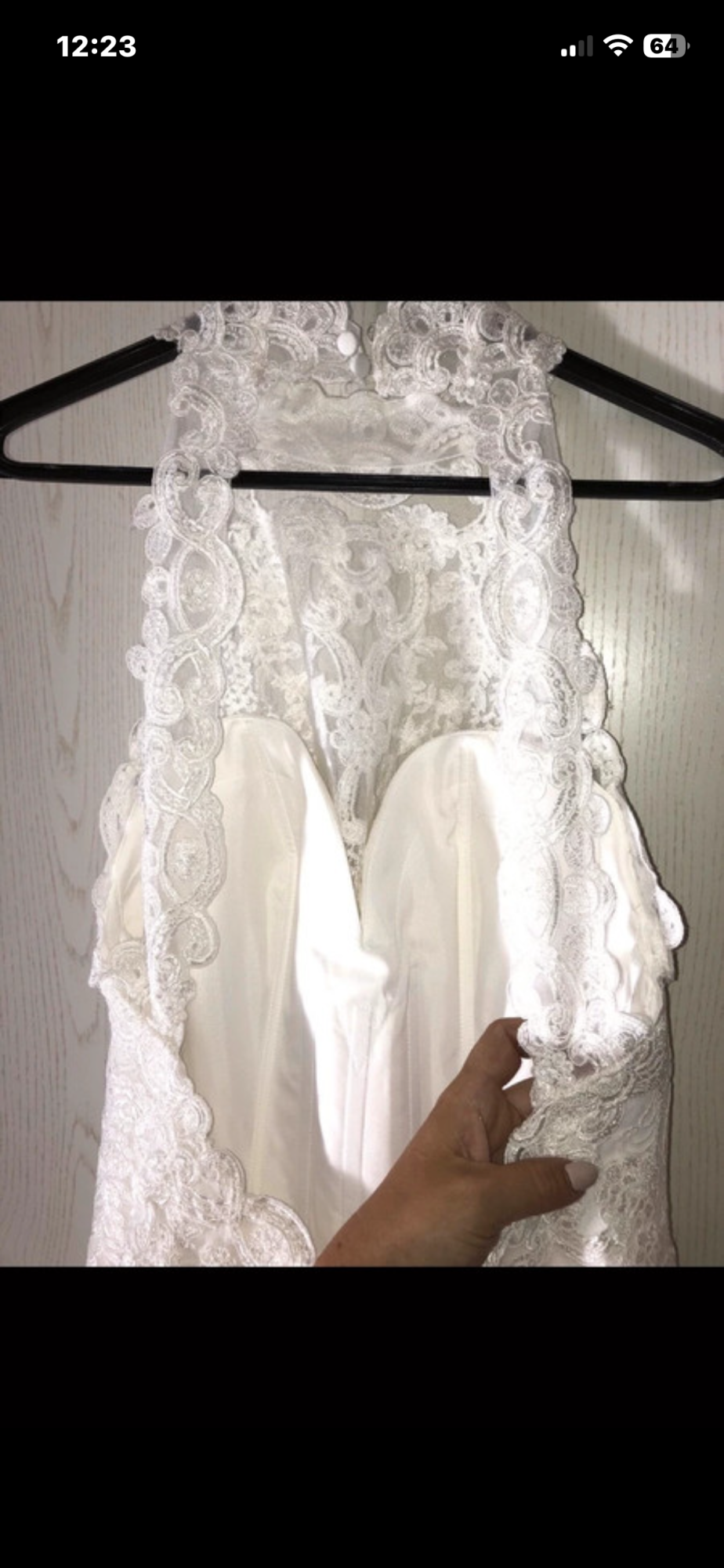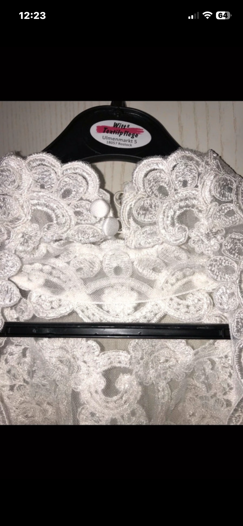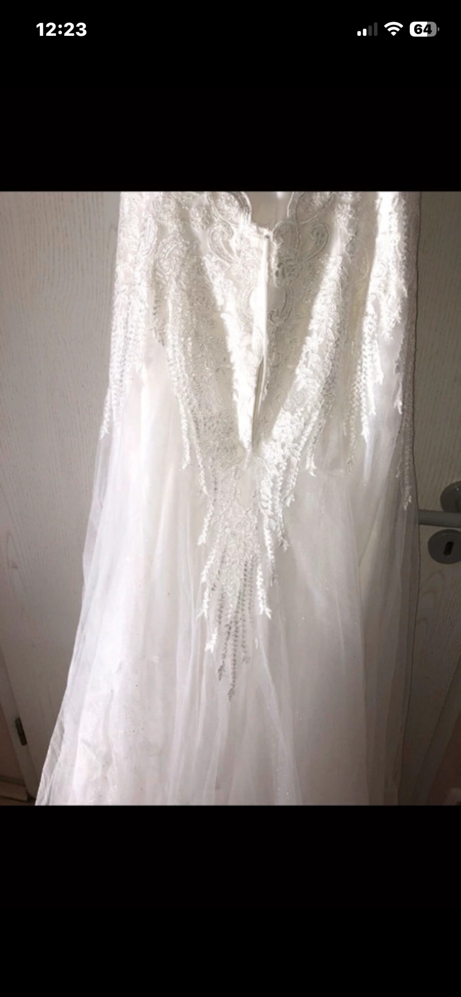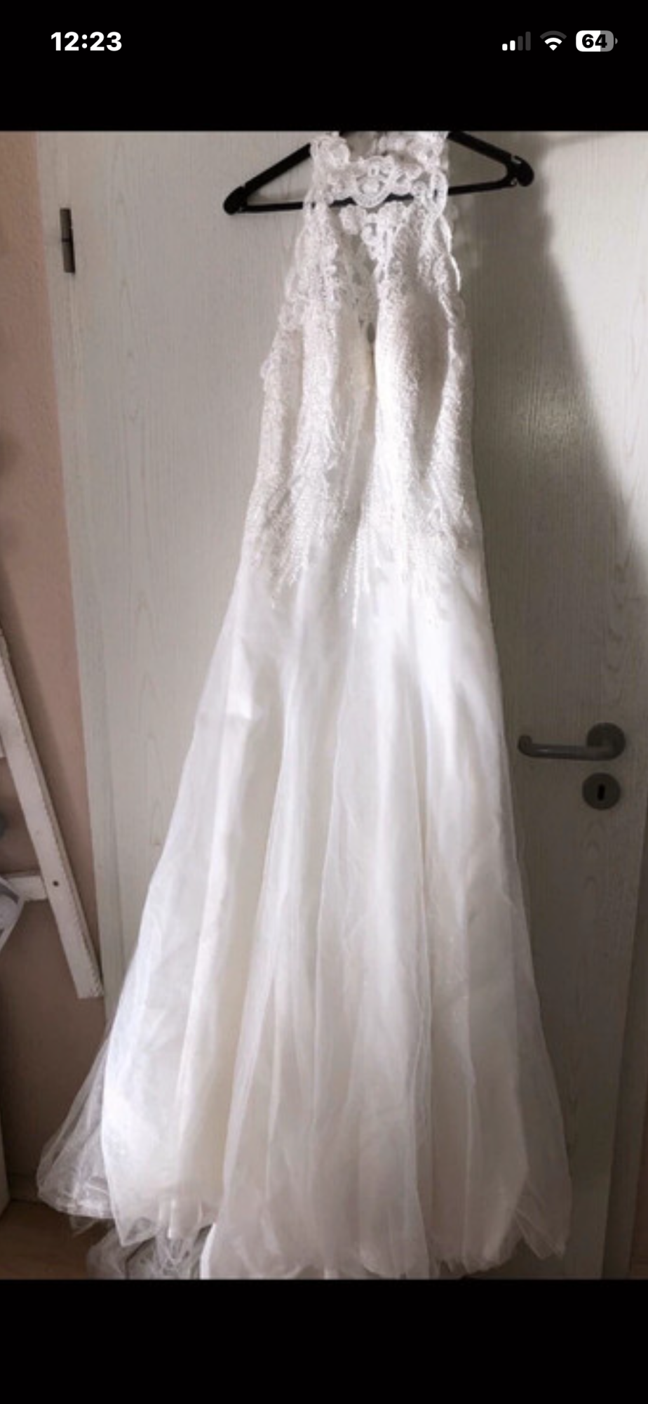 Hallo ..... zu verkaufen ist mein tolles Brautkleid 38/40, Elfenbein, Kleid ist aus Spitze ( oben durchsichtiger Stoff, komplett kleine Pailetten, Glitzer ), Unterkleid ist aus komplett Glitzer Tüll( dadurch sehr leicht zum tragen), nur ein kleiner Unterrock, hinten mit Schleppe ( die man dann hochbinden kann zum Tanzen ), vorne gekürzt, großer Rückenausschnitt aus Spitze, übern Hals Schließbar mit Knöpfen, unterer Teil Reißverschluss, wurde gereinigt, kann gerne verschickt werden!!!! Paypal oder Überweisung vorhanden !!! Kurzer Schleier in Elfenbein gibt es noch dazu