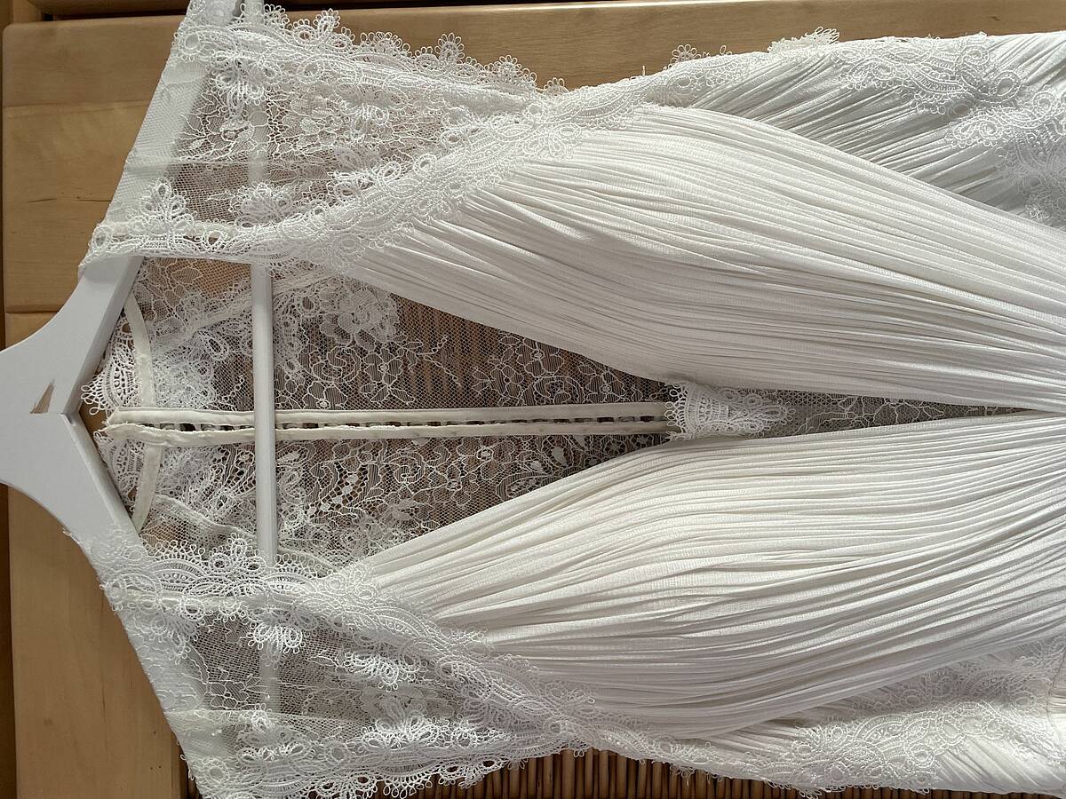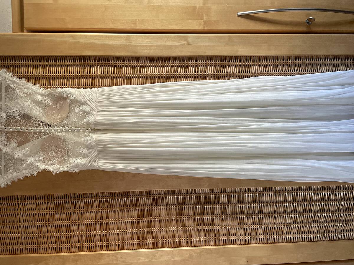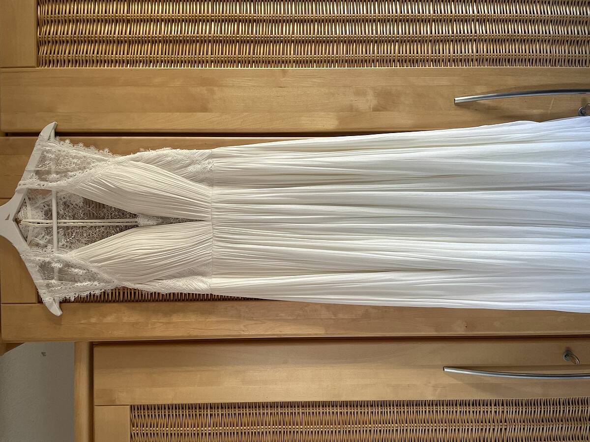 Ich verkaufe schweren Herzens mein wunderschönes Hochzeitskleid der Designerin Catherine Deane (Modell: Anastasia). Das Kleid besticht durch seine zeitlose Eleganz, die hochwertige Spitze und ein unglaublich angenehmes Tragegefühl. Wer die Designerin kennt, weiß, wie fließend und leicht ihre Stoffe fallen. Die zwei inneren Lagen sind pure Seide, die außenlage ist polyester. • Besonderheiten: Filigrane Spitzen-Applikationen am Oberteil, ein wunderschöner V-Ausschnitt und ein eleganter Rückenausschnitt. Zustand & Änderungen: • Das Kleid wurde nur einmal an meinem Hochzeitstag für den Abend getragen. • Es wurde im Anschluss professionell gereinigt und weist keine sichtbaren Mängel oder Flecken auf. • Änderungen: - Achtung - Die Länge wurde auf meine Körpergröße angepasst - Es wurden Cups eingenäht Maße für die Passform: Damit du einschätzen kannst, ob es dir passt: • Meine Körpergröße: 174 cm (ich habe dazu Ballerinas zum Tanzen ohne Absatz getragen). • Brustumfang: ca. 34 cm • Taillenumfang: ca. 35 cm Zubehör (optional): inkl. Kleidersack Nur versicherter Versand Ich hoffe, dass dieses Kleid eine weitere Braut so glücklich macht wie mich an meinem großen Tag! Bei Fragen meldet euch gerne. Privatverkauf: Der Verkauf erfolgt unter Ausschluss jeglicher Gewährleistung.