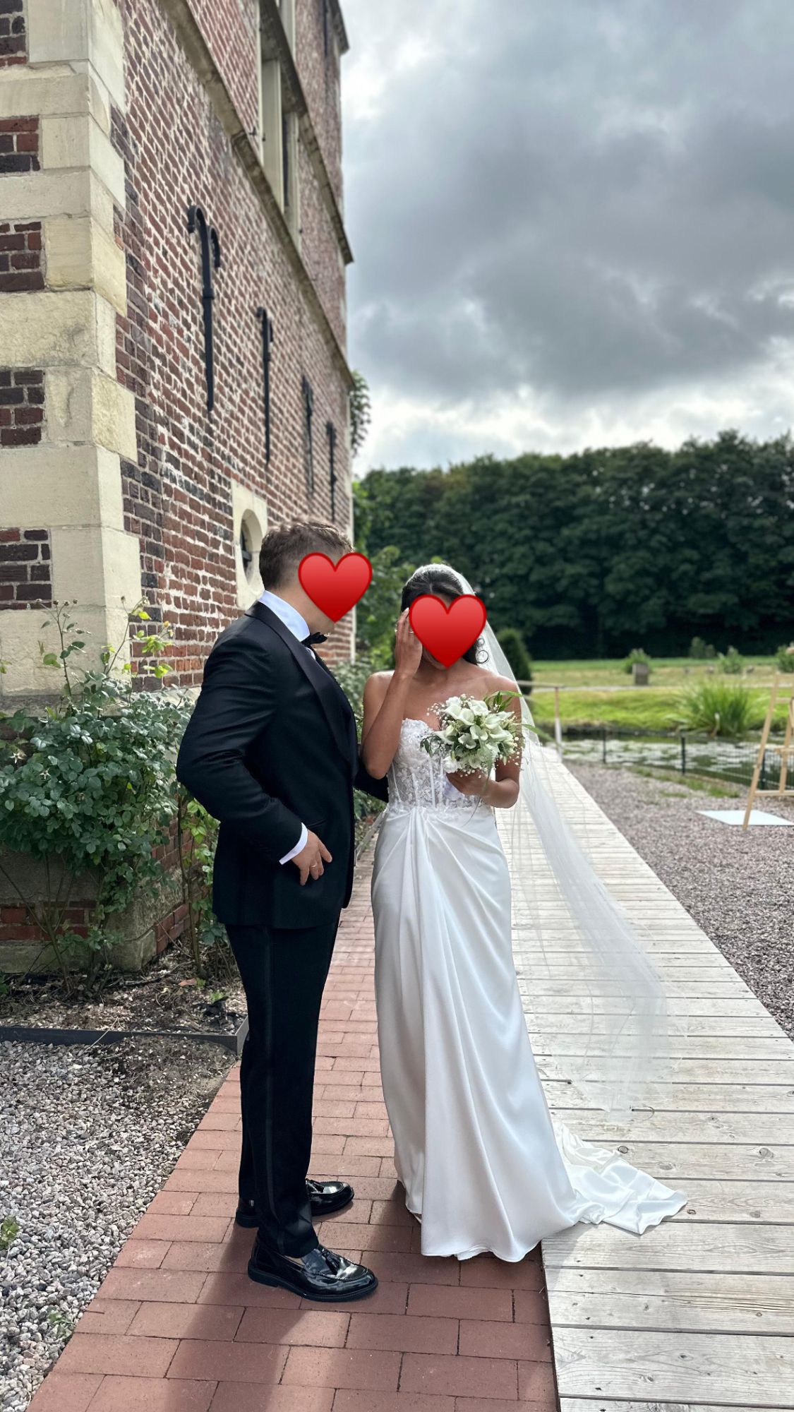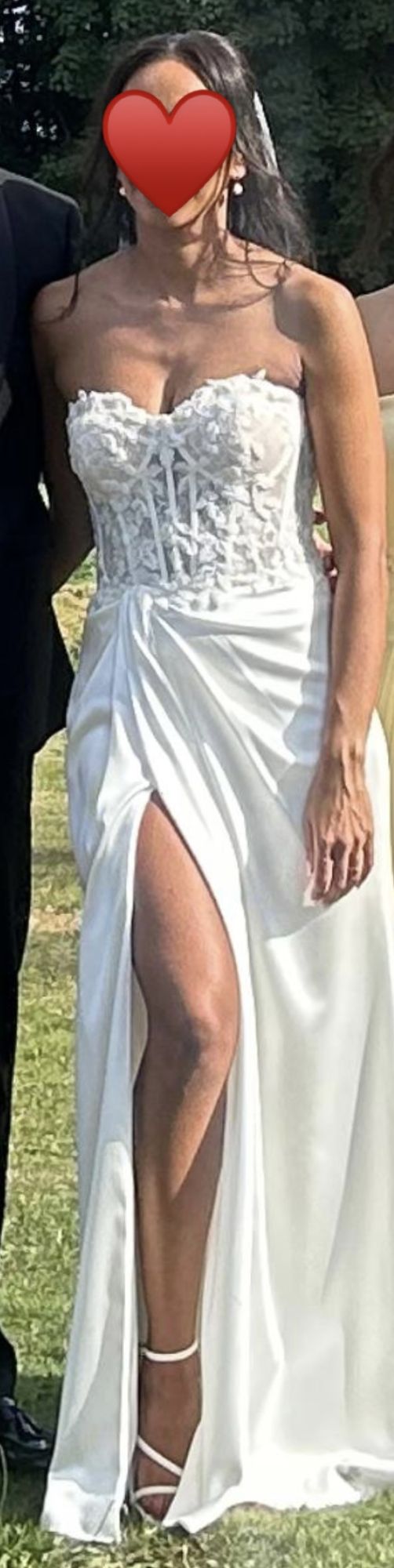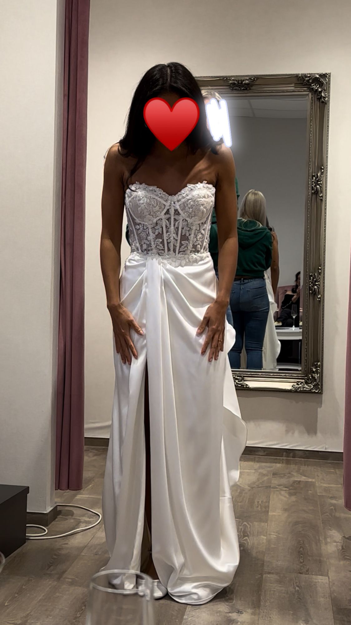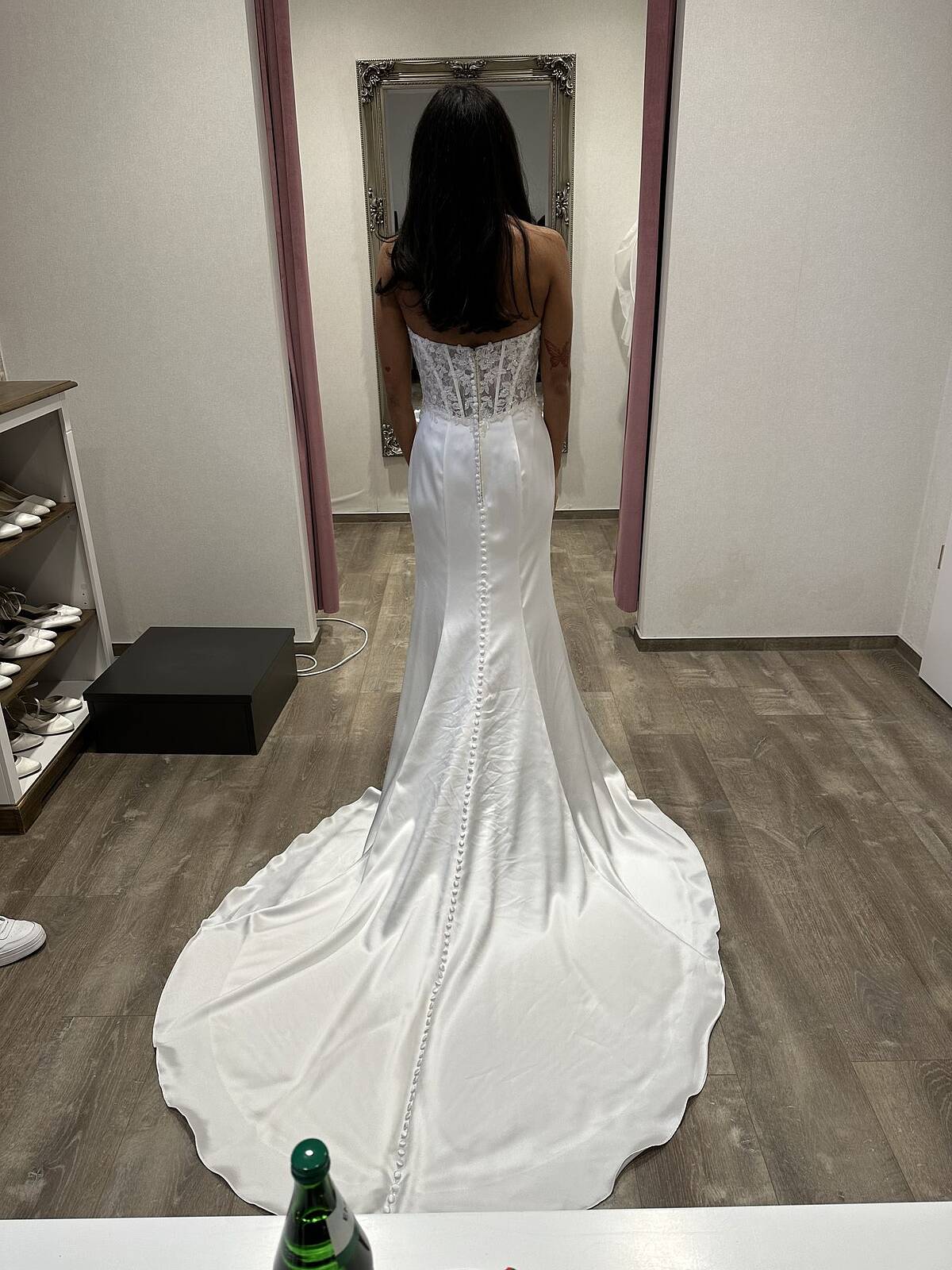 ???? Justin Alexander „Hadley“ – modernes Traumkleid mit Schleppe & Schleier (Größe 34) Ich verkaufe mein wunderschönes Brautkleid „Hadley“ von Justin Alexander, das ich nur einmal zur Hochzeit getragen habe. Es ist professionell gereinigt und in sehr gutem Zustand. Das Kleid besticht durch seine figurschmeichelnde Fit-and-Flare-Silhouette mit einem herzförmigen, trägerlosen Ausschnitt und einem zarten, transparenten Oberteil. Der seitliche Schlitz im Rock verleiht dem Kleid eine moderne, elegante Note. Es wurde enger gemacht (Größe 34) und im Brustbereich mit Push-Up-Elementen versehen, die die Brust optisch um etwa zwei Größen vergrößern – für ein besonders schönes Dekolleté. Ein echtes Highlight ist die wunderschöne Schleppe, die mit einer langen Knopfleiste verziert ist – vom Rücken bis zum Ende der Schleppe. Nach der Zeremonie kann die Schleppe praktisch hochgesteckt werden, sodass sie beim Feiern nicht im Weg ist. Ein passender, schlichter Schleier ist ebenfalls dabei und kann auf Wunsch mitverkauft werden.