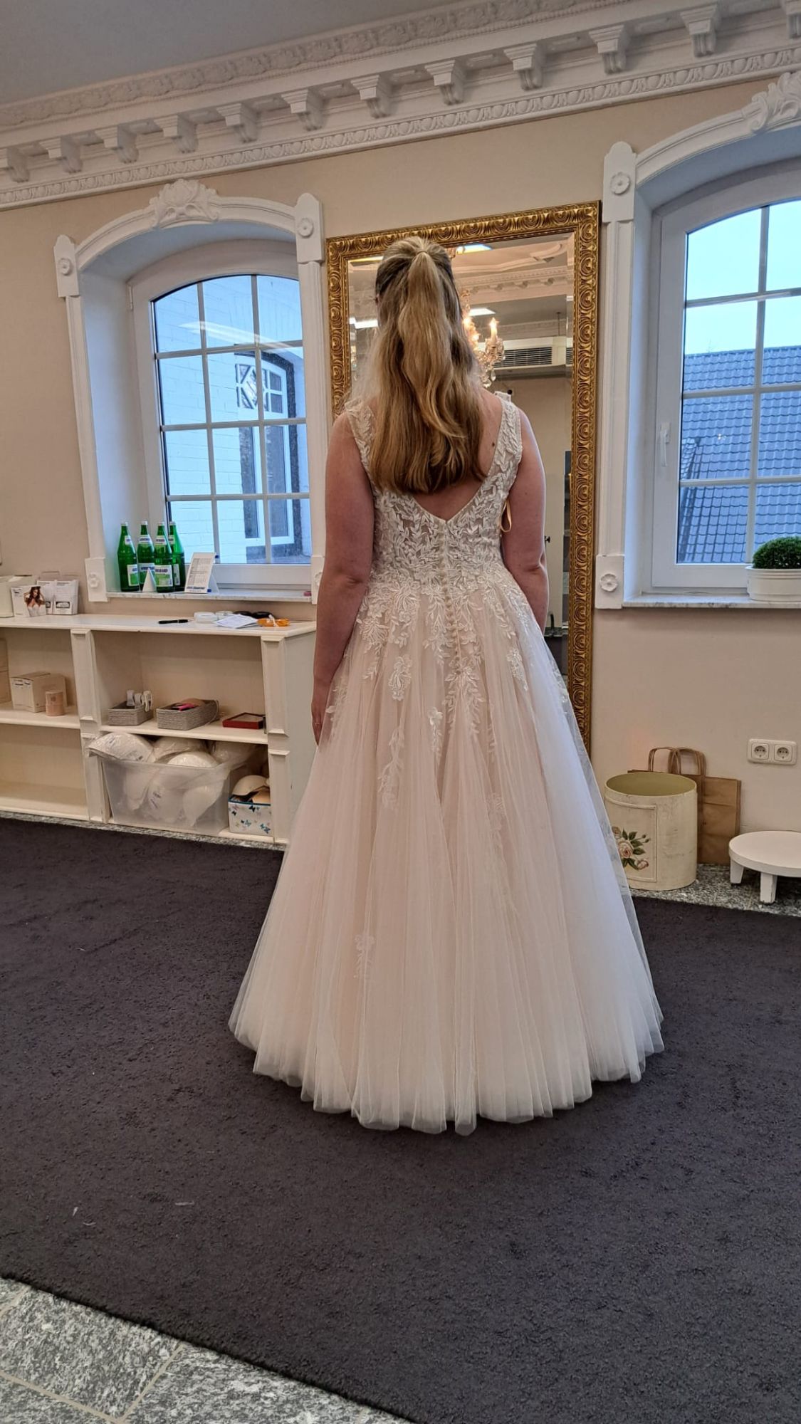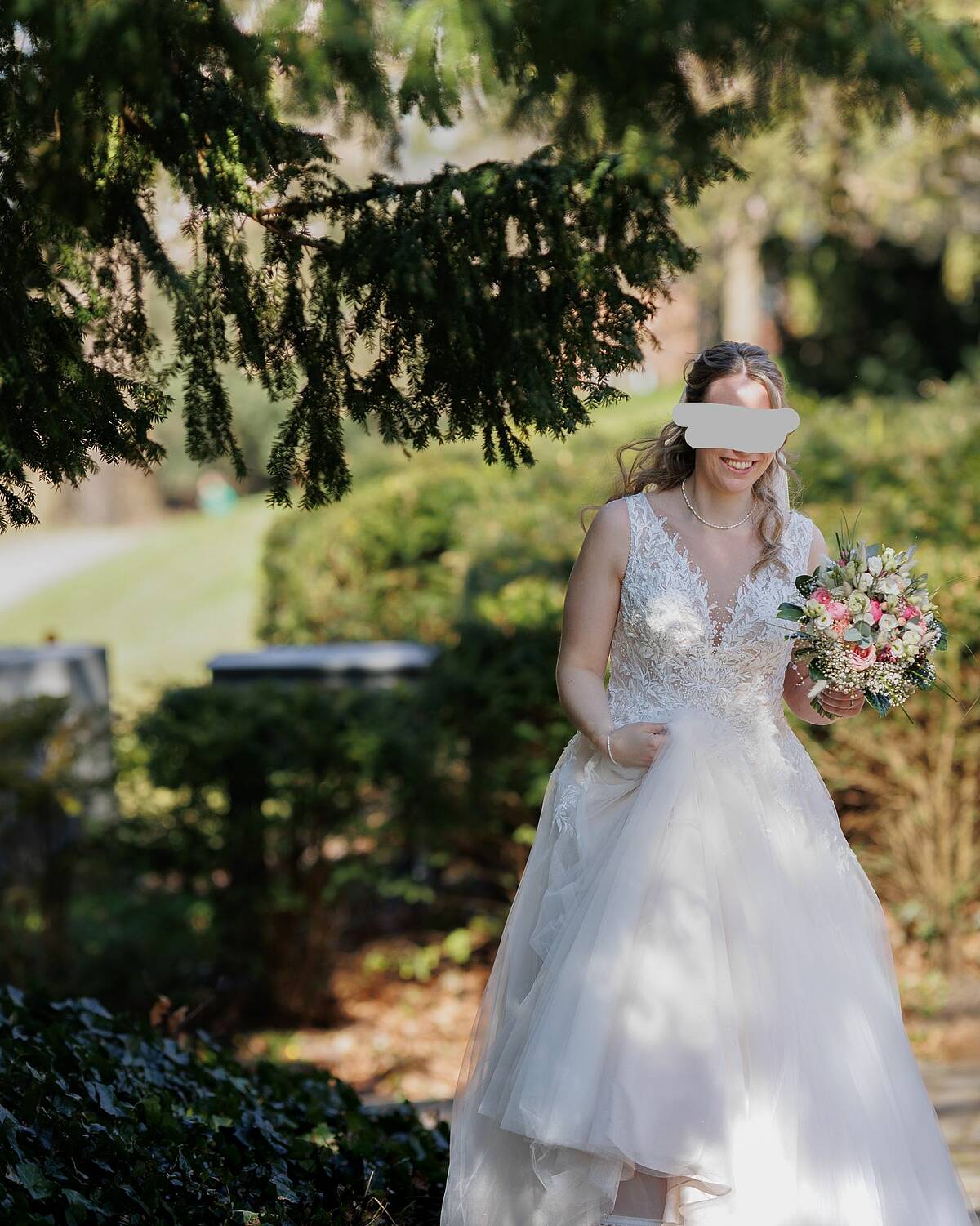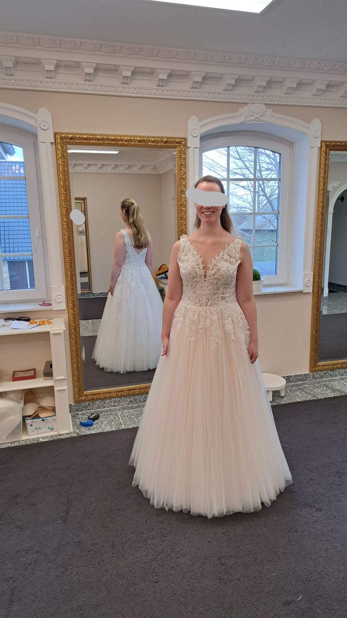 Das Oberteil ist vollständig mit feinen Perlenapplikationen verziert, die sich spielerisch in den Ausschnitt und sanft über den Rock hinwegziehen. (Tipp: Ich habe dazu Perlenschmuck getragen – das passt perfekt zum Stil.) Der Rock besteht aus drei Lagen zartem Tüll, wobei die mittlere Lage einen dezenten Glitzereffekt besitzt und dem Kleid bei Bewegung ein elegantes Funkeln verleiht. Ein Reifrock ist inklusive – kein Muss, aber sehr hilfreich, da er das Laufen und Gehen im Kleid angenehmer macht. Die Farbe des Kleides ist ein romantisches Blush. Wichtig: Im Original (erstes Bild mit Modell) verfügt das Kleid über eine Schleppe, die ich professionell abnehmen lassen habe. Das Kleid wurde außerdem leicht gekürzt – ich bin 1,73 m groß und habe es mit 5 cm hohen Schuhen getragen. Eine Anprobe in Hamburg ist nach Absprache gerne möglich.