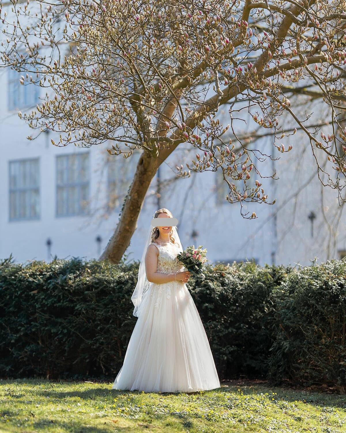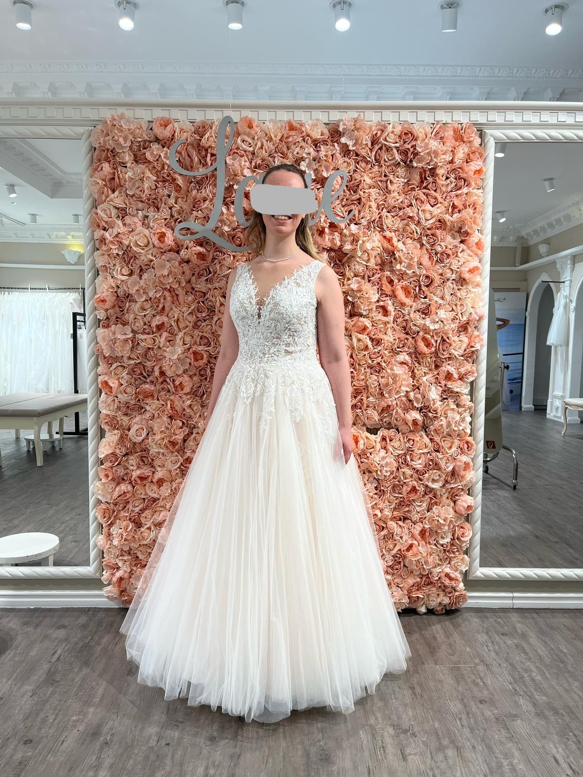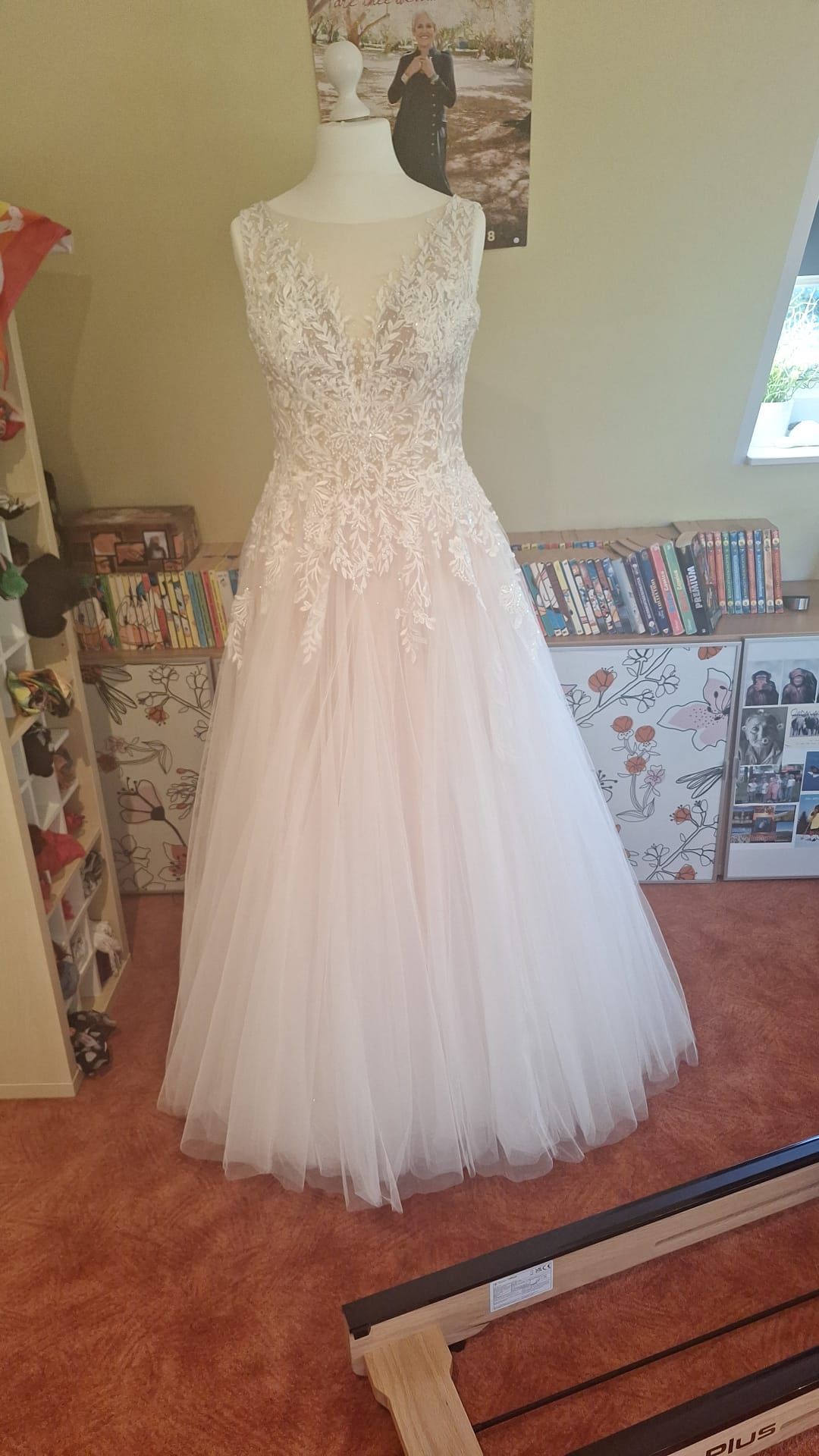 Das Oberteil ist vollständig mit feinen Perlenapplikationen verziert, die sich spielerisch in den Ausschnitt und sanft über den Rock hinwegziehen. (Tipp: Ich habe dazu Perlenschmuck getragen – das passt perfekt zum Stil.) Der Rock besteht aus drei Lagen zartem Tüll, wobei die mittlere Lage einen dezenten Glitzereffekt besitzt und dem Kleid bei Bewegung ein elegantes Funkeln verleiht. Ein Reifrock ist inklusive – kein Muss, aber sehr hilfreich, da er das Laufen und Gehen im Kleid angenehmer macht. Die Farbe des Kleides ist ein romantisches Blush. Wichtig: Im Original (erstes Bild mit Modell) verfügt das Kleid über eine Schleppe, die ich professionell abnehmen lassen habe. Das Kleid wurde außerdem leicht gekürzt – ich bin 1,73 m groß und habe es mit 5 cm hohen Schuhen getragen. Eine Anprobe in Hamburg ist nach Absprache gerne möglich.