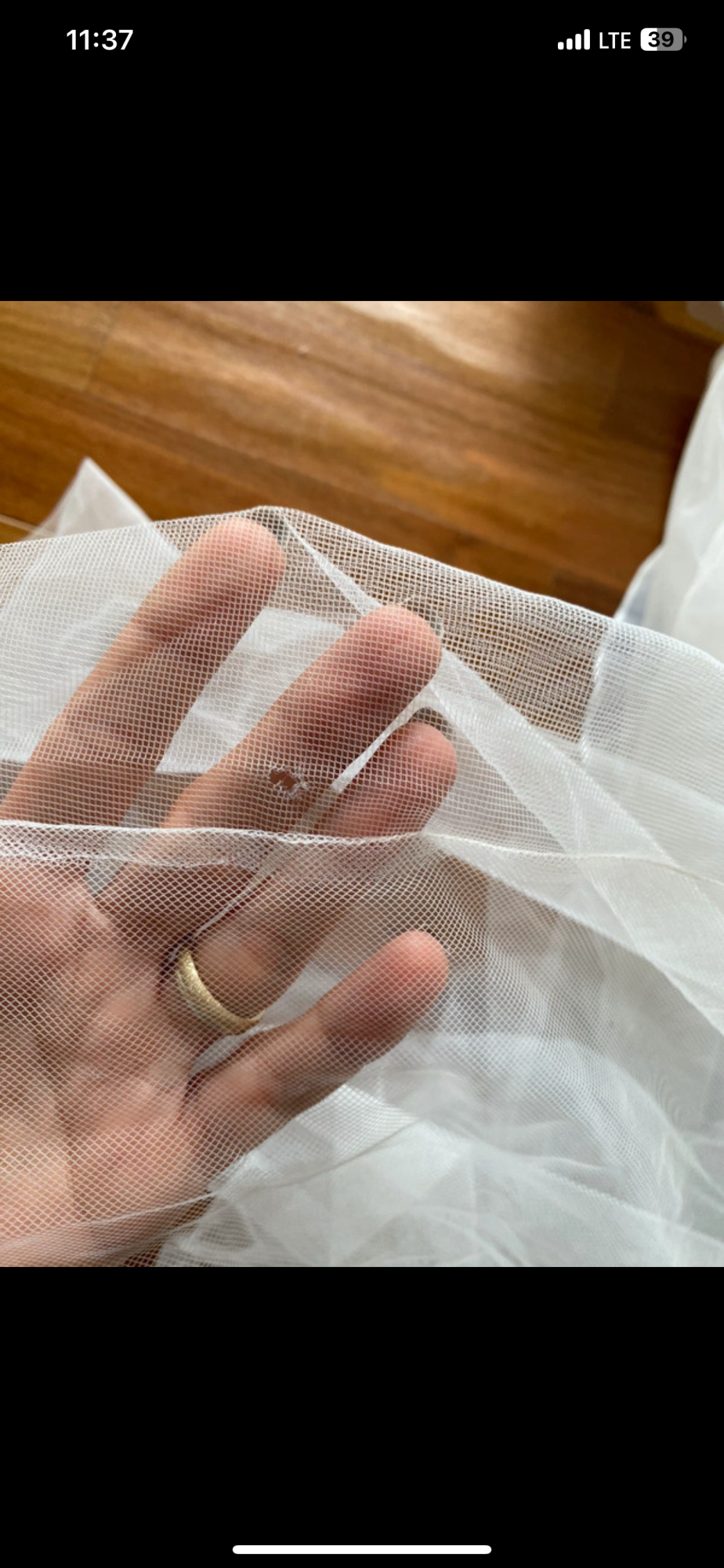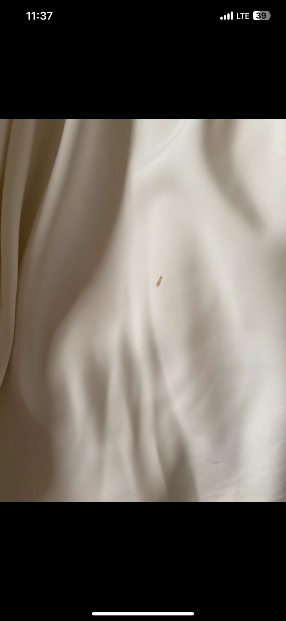 Das Kleid hat, trotz professioneller Reinigung, an den unteren Lagen der Schleppe kleinere Flecke/ Abdrücke von den Absätzen zurückbehalten. (Siehe Bilder) Diese sind angezogen von Außen aber nicht sichtbar.