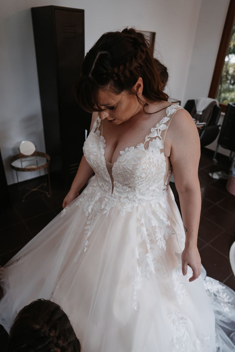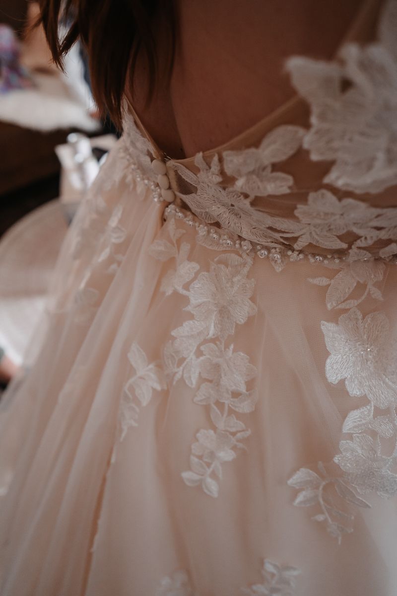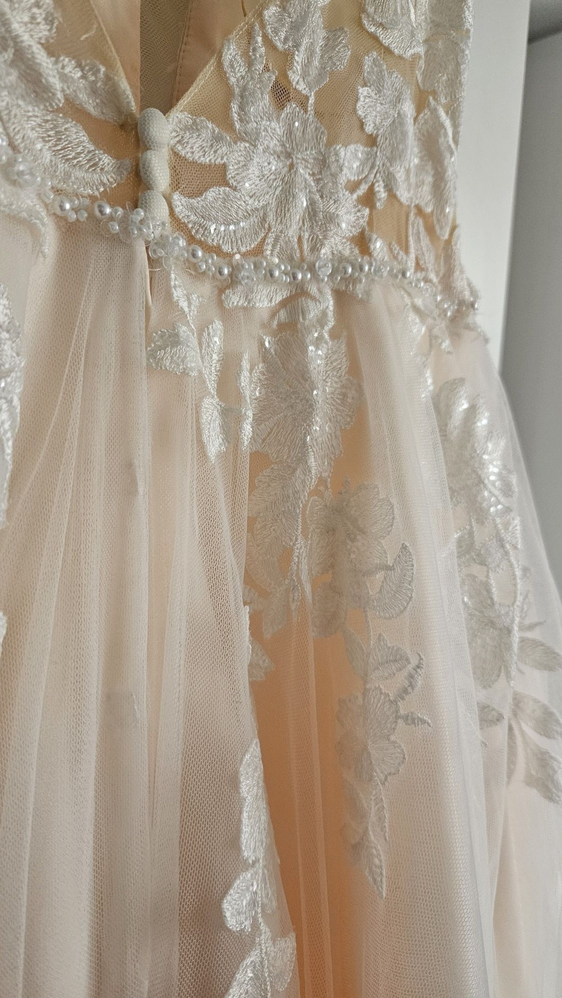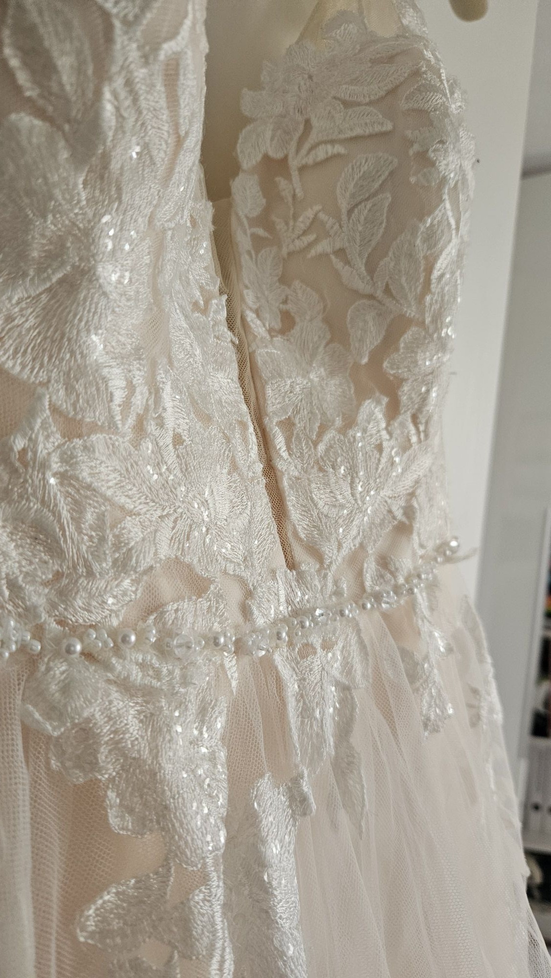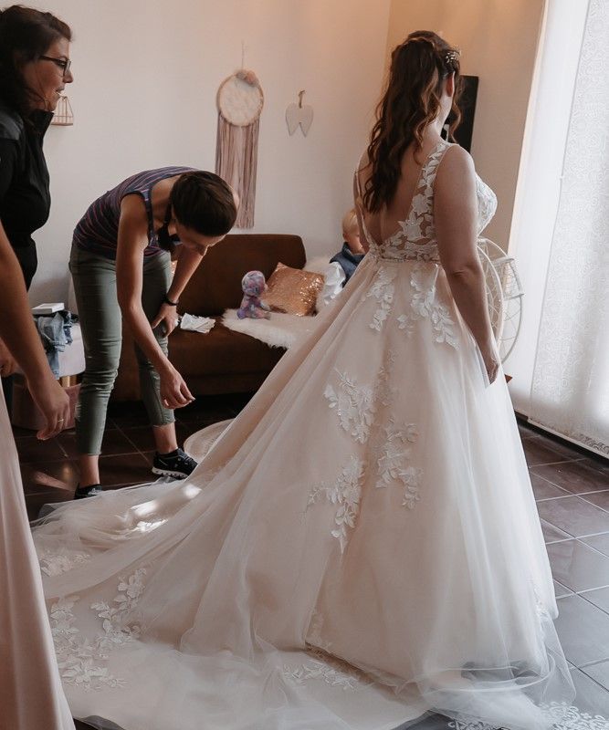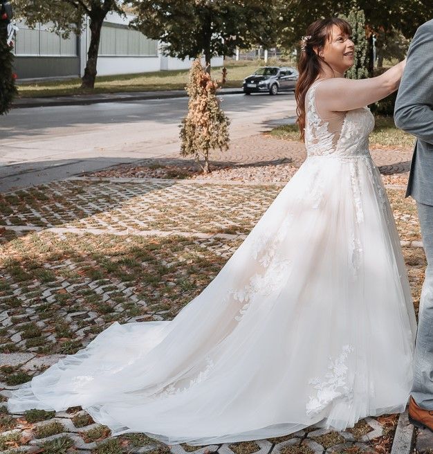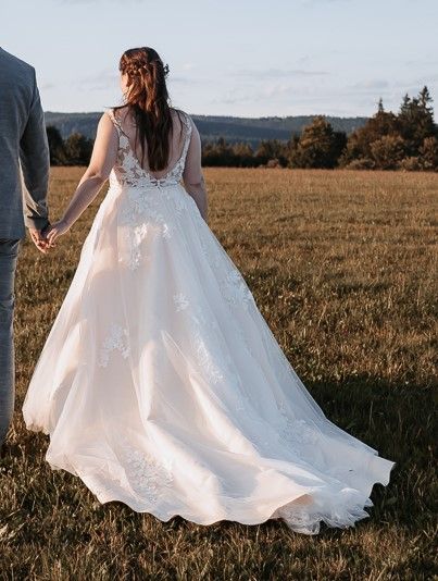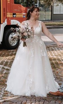 Dieses wunderschöne Brautkleid vereint zeitlose Eleganz mit romantischen Details. Der fließende Rock aus mehreren Lagen feinem Tüll sorgt für eine traumhafte Silhouette. Die filigranen Spitzenapplikationen am Oberteil und entlang des Rocks verleihen dem Kleid eine besonders edle und feminine Ausstrahlung.