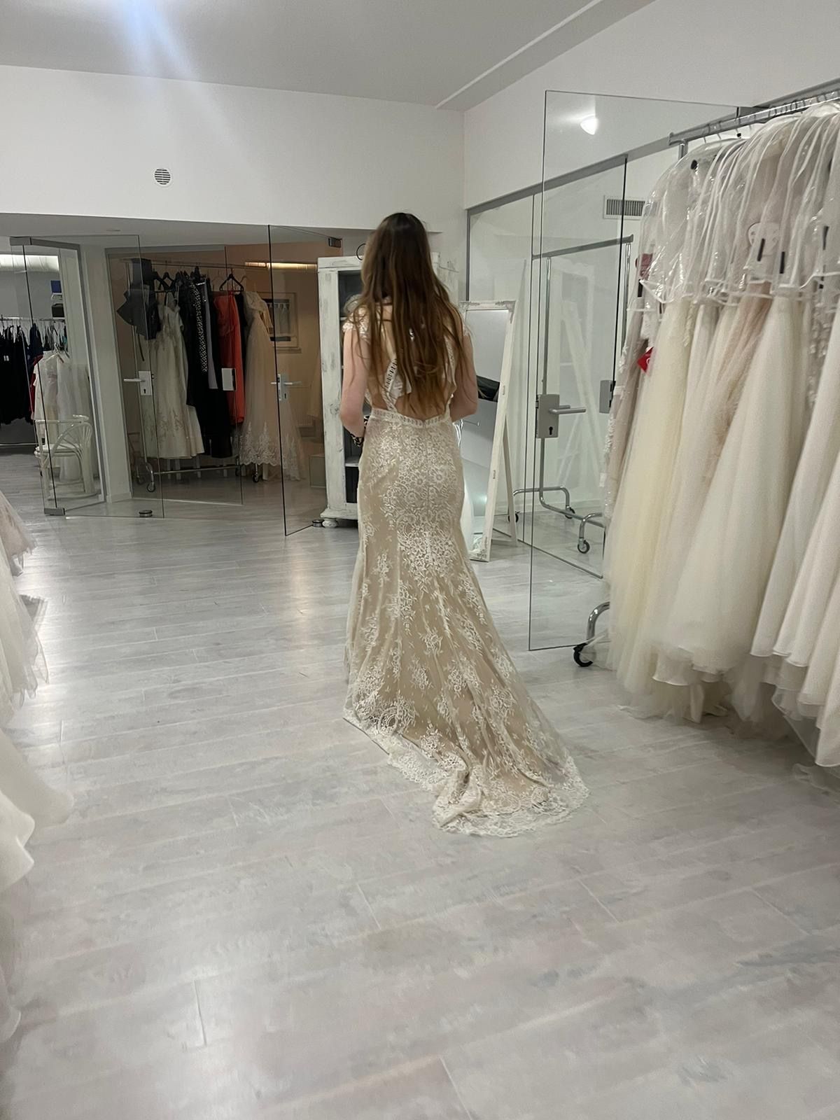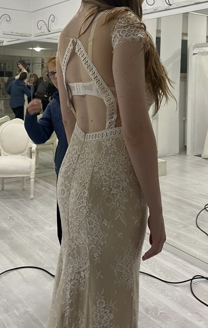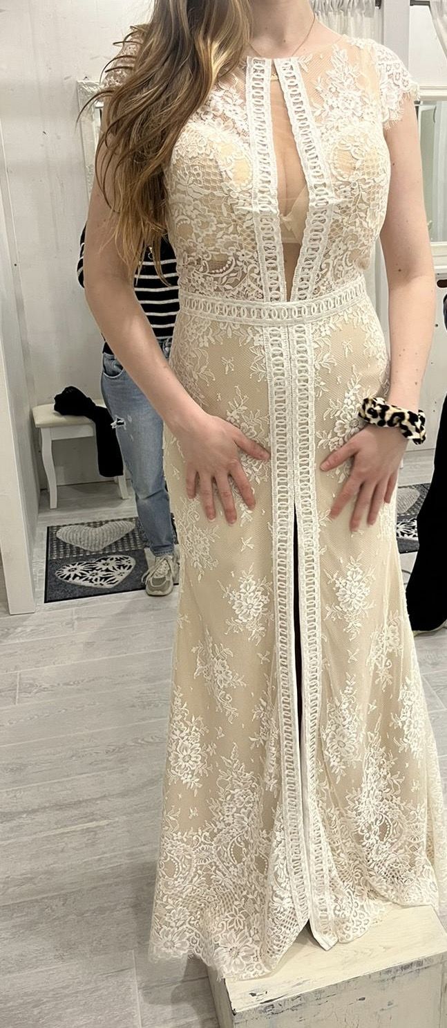 Verkaufe dieses wunderschöne, bodenlange Kleid mit aufwendiger Floral-Spitze. Der beige Unterstoff sorgt für einen modernen Nude-Effekt, der die weiße Spitze toll zur Geltung bringt. • Zustand: Neu und ungetragen. • Details: Edle Häkelborten-Optik, die die Figur streckt, und feminine Kurzärmel. • Besonderheit: Eingearbeitete Cups/Körbchen für optimalen Halt (BH-los tragbar). • Schnitt: Tiefer V-Ausschnitt mit dezentem Mesheinsatz. • Anlass: Perfekt für Standesamt, Hochzeitsgäste oder festliche Events.