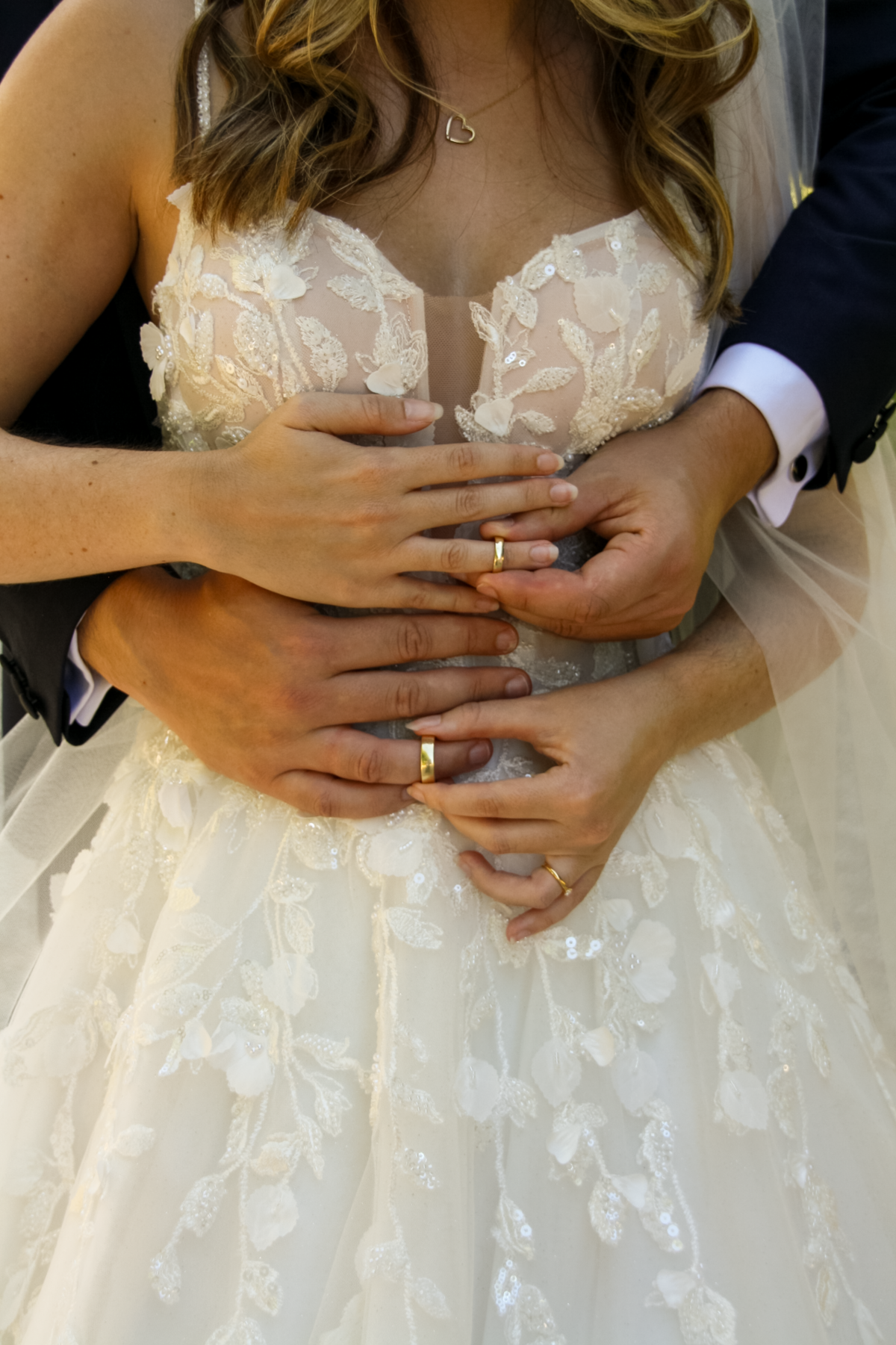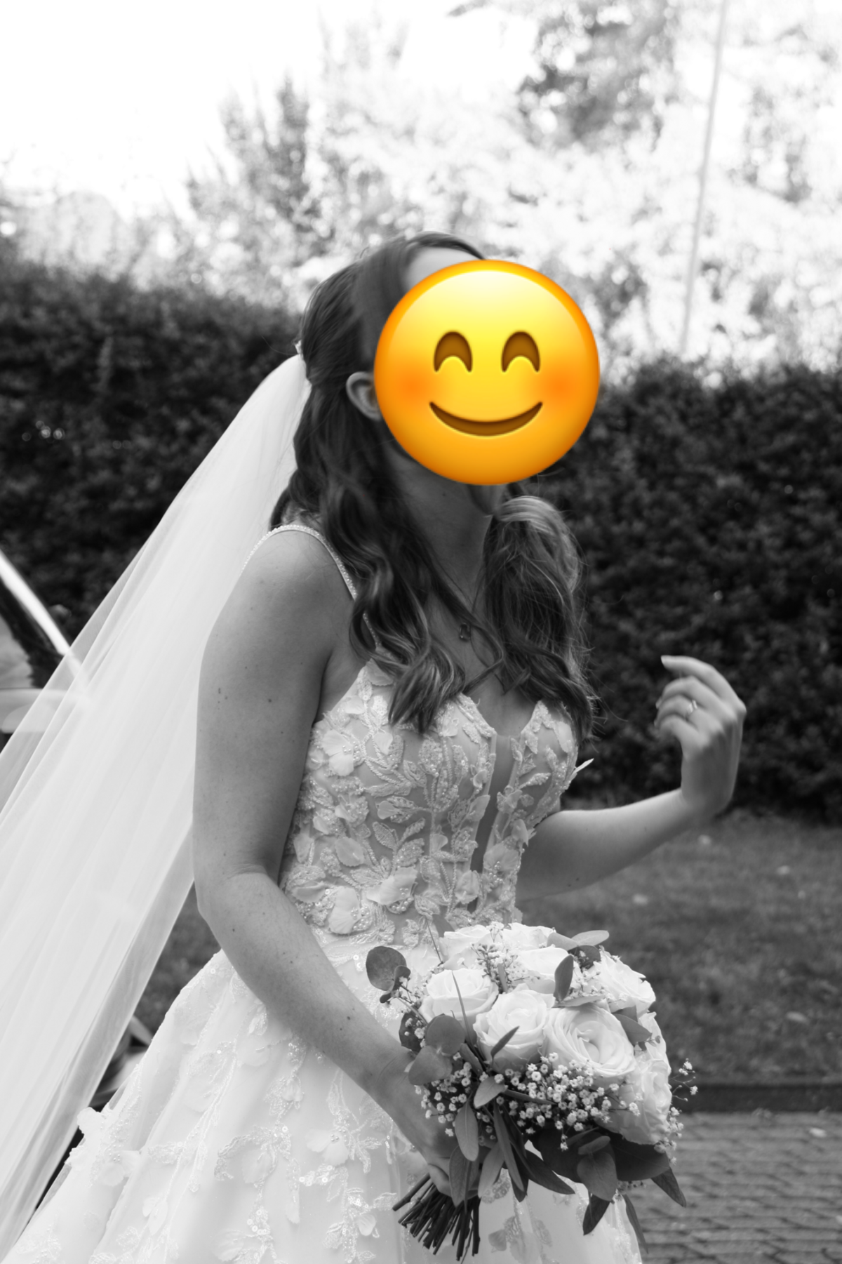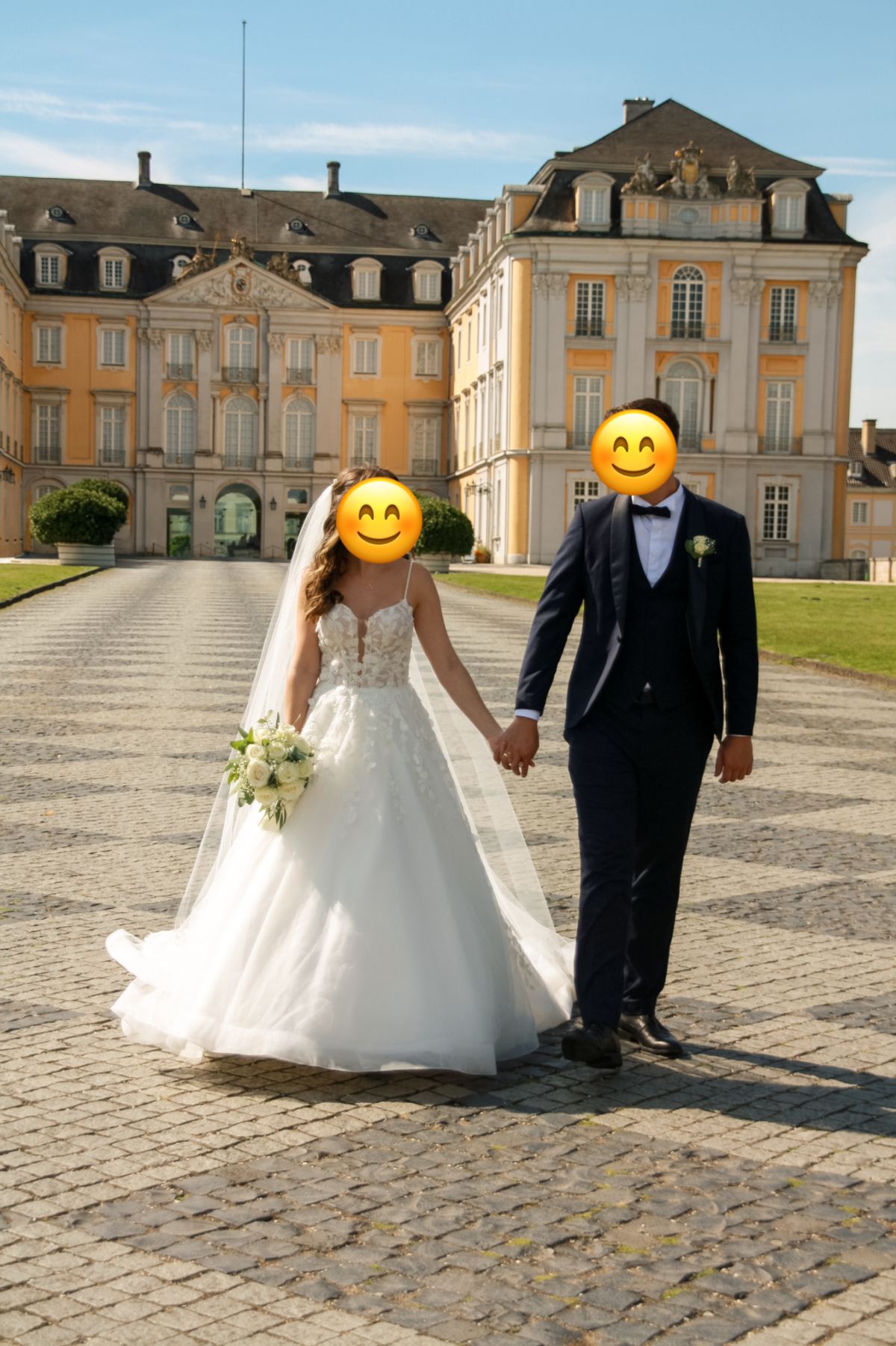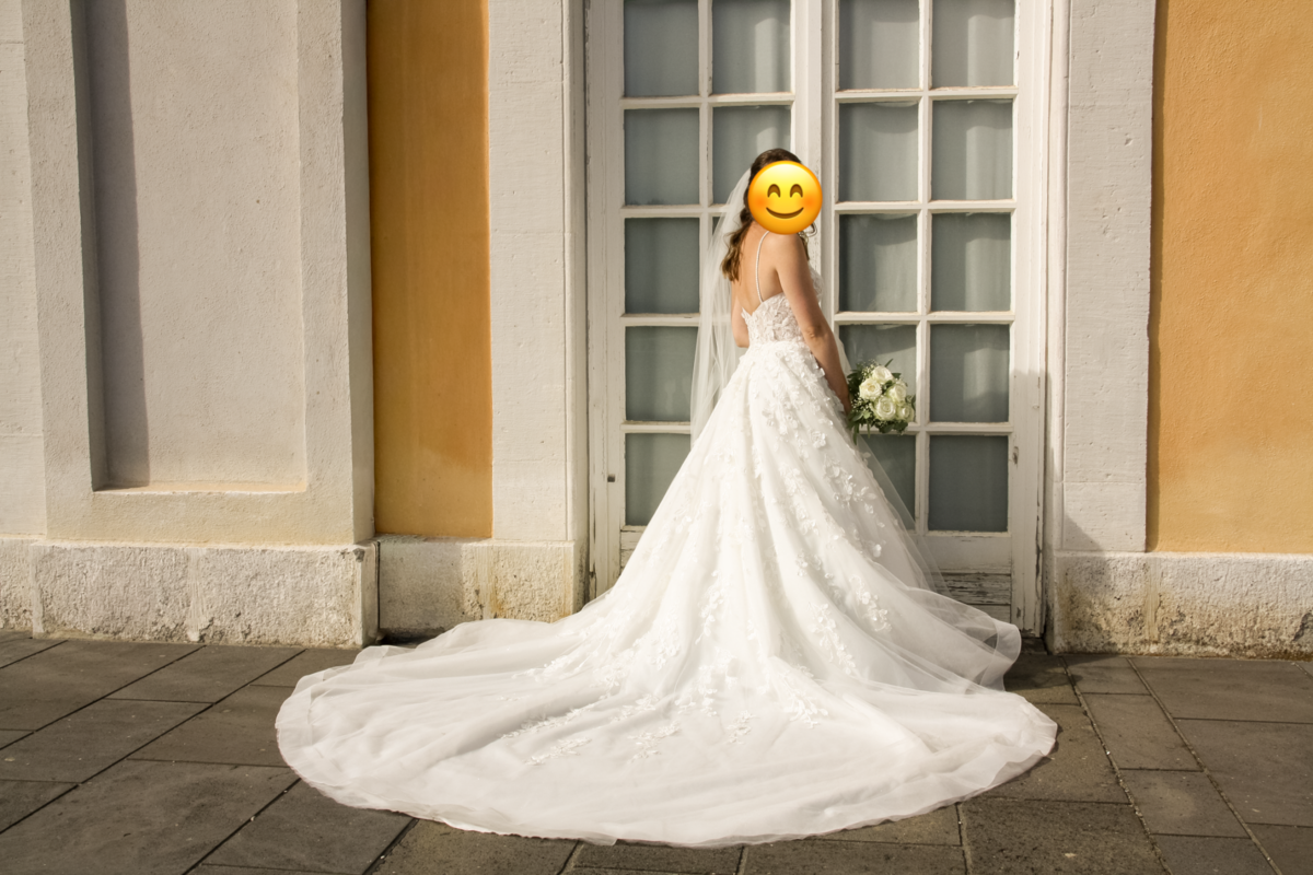 Dieses traumhafte ivory farbene Brautkleid von Oliver Martino (Modell Sidney) ist ein echtes Schmuckstück – elegant, detailverliebt und unglaublich schmeichelhaft. Das Kleid besticht durch ein halbtransparentes, mit Stäbchen gearbeitetes Oberteil, das durch zarte, mit Perlen besetzte Träger gehalten wird. Der tiefe V-Ausschnitt sorgt für einen Hauch von Drama, ohne dabei seine edle Wirkung zu verlieren. Die A-Linie fließt sanft über die Hüfte und formt eine wunderschön feminine Silhouette. Ein feiner Glitzer-Unterstoff verleiht dem Kleid einen dezenten Schimmer, der besonders im Sonnenlicht oder auf Fotos zur Geltung kommt. Das absolute Highlight ist die aufwendig bestickte florale Spitzenapplikation, die sich vom Mieder über den Rock bis in die kapellenlange Schleppe zieht – ein Anblick, der jedem Moment eine märchenhafte Note verleiht. Das Kleid wurde mit einem Reifrock mit 2 Ringen getragen (kann bei Interesse ebenfalls erworben werden) und einer Körpergröße von 165,5 cm angepasst. Außerdem wurde von der Schneiderin die Möglichkeit eingearbeitet, die Schleppe hochzustecken. Darüber hinaus ist auch noch ein Stück zusätzlicher Spitze vorhanden, falls Änderungen gewünscht sind. Das Kleid wurde nach der Hochzeit bereits professionell gereinigt und befindet sich in einwandfreiem Zustand – bereit, eine neue Braut an ihrem großen Tag strahlen zu lassen.