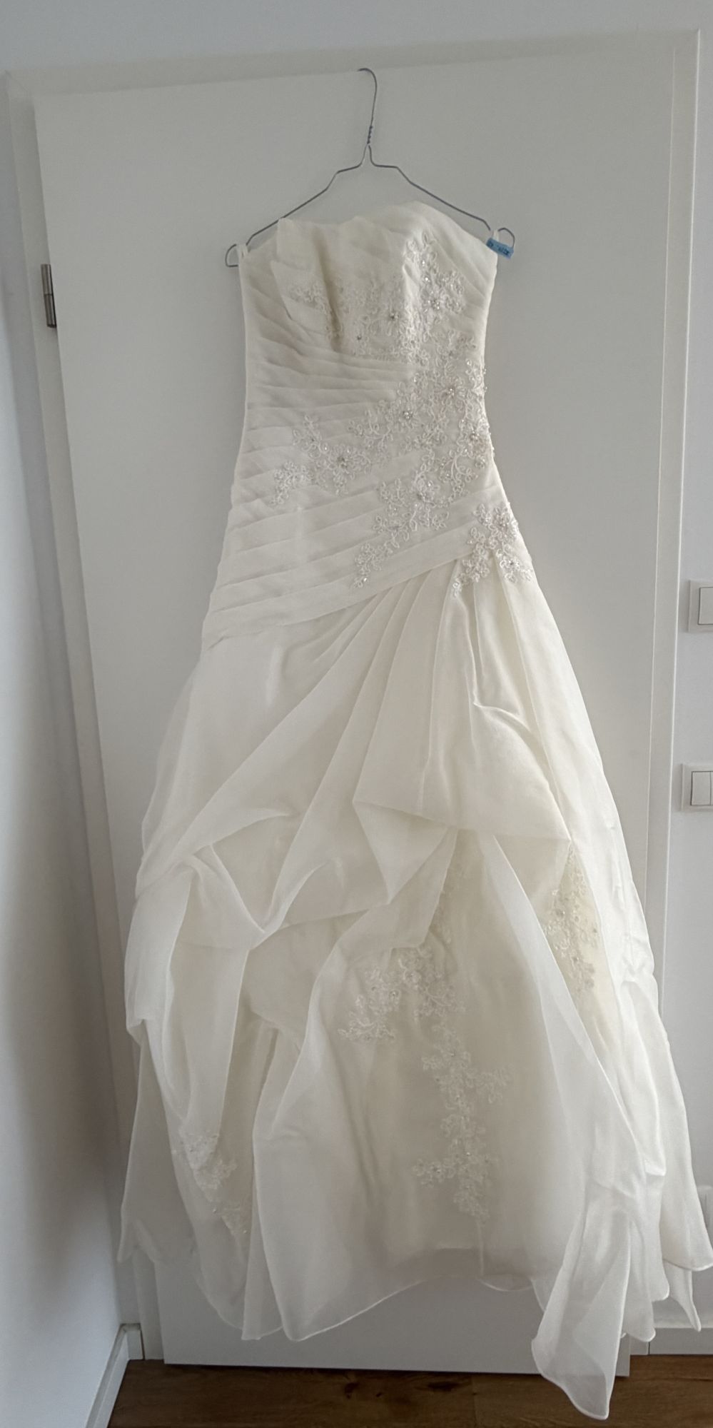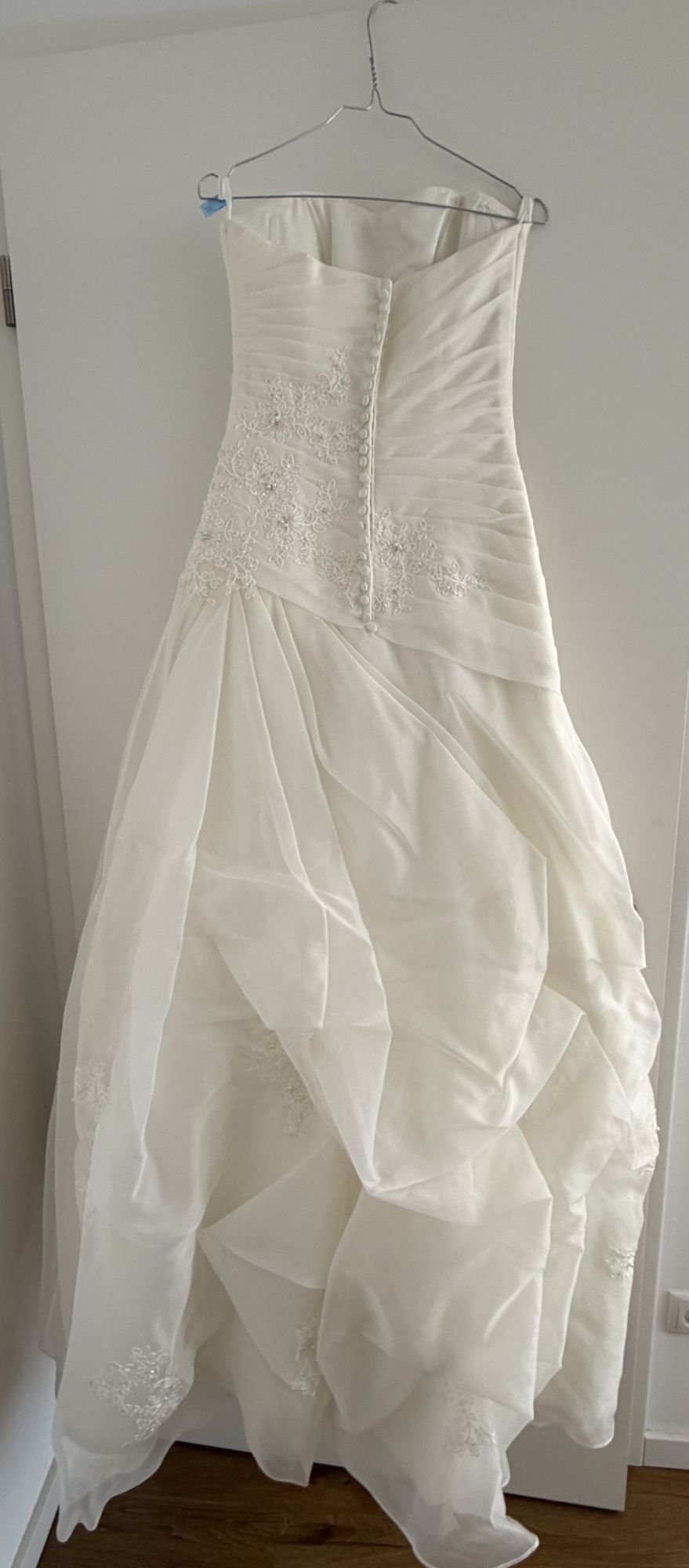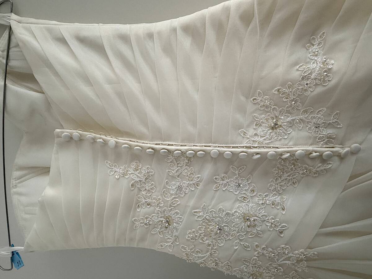 Ich verkaufe mein wunderschönes Brautkleid mit Bolero und Reifrock. Das Kleid wurde nur 1x getragen und dann fachmännisch gereinigt. Es wird sorgfältig aufbewahrt und befindet sich in einem Nichtraucherhaushalt ohne Tiere und Kinder. Gegen Kostenübernahme kann das Kleid gerne per DHL innerhalb Deutschlands versendet werden. Meine Maße: 170cm groß Oberweite: 88cm Taille: 63cm Hüfte: 91cm Farbe: creme Größe: 38 steht im Kaufvertrag ,40 steht auf dem Etikett im Kleid. Da dies ein Privatverkauf ist, gibt es keine Garantie oder eine Rechnung. Eine Rücknahme ist ausgeschlossen. Ich möchte, dass dieses besondere Kleid eine zweite Braut glücklich macht.