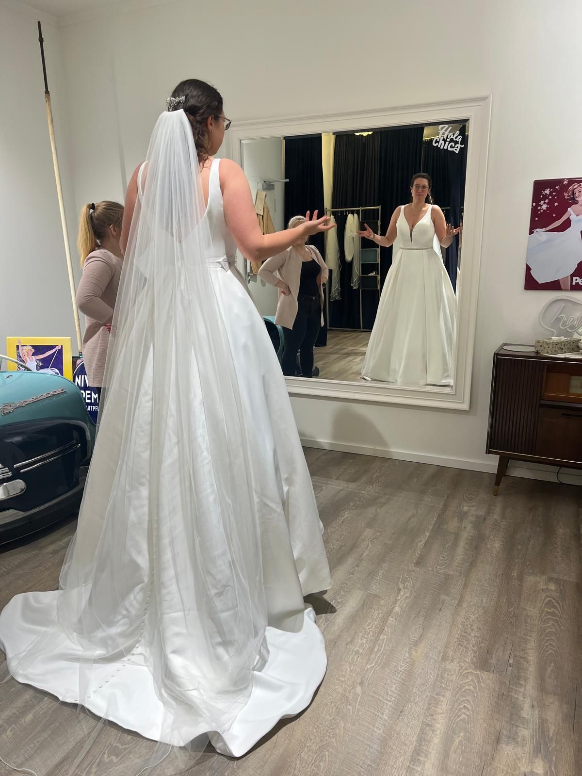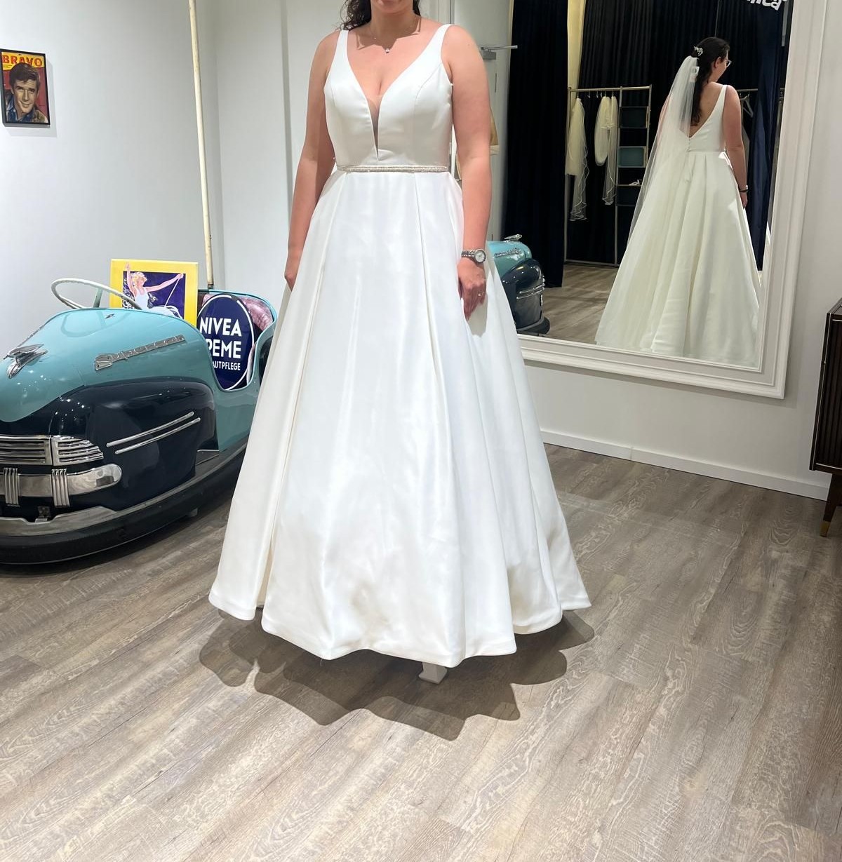 Das Kleid ist schlicht, elegant und auch ein bisschen sexy. Es ist aus einem weichen aber festen Stoff und hat eine Mittel lange Schleppe (die kommt im Bild nicht so gut rüber) Ein glitzernder Gürtel oder andere Accessoires geben dem Kleid den letzten Schliff. Es ist ganz neu wurde außer bei der Anprobe nicht getragen. Ist also auch noch nicht von einem Schneider*in gekürzt oder anderweitig geändert worden. Auf Grund einer Verletzung am Rücken war es mir unangenehm Rücken frei zu tragen deshalb ging ich dann nochmal neu auf Kleidersuche.