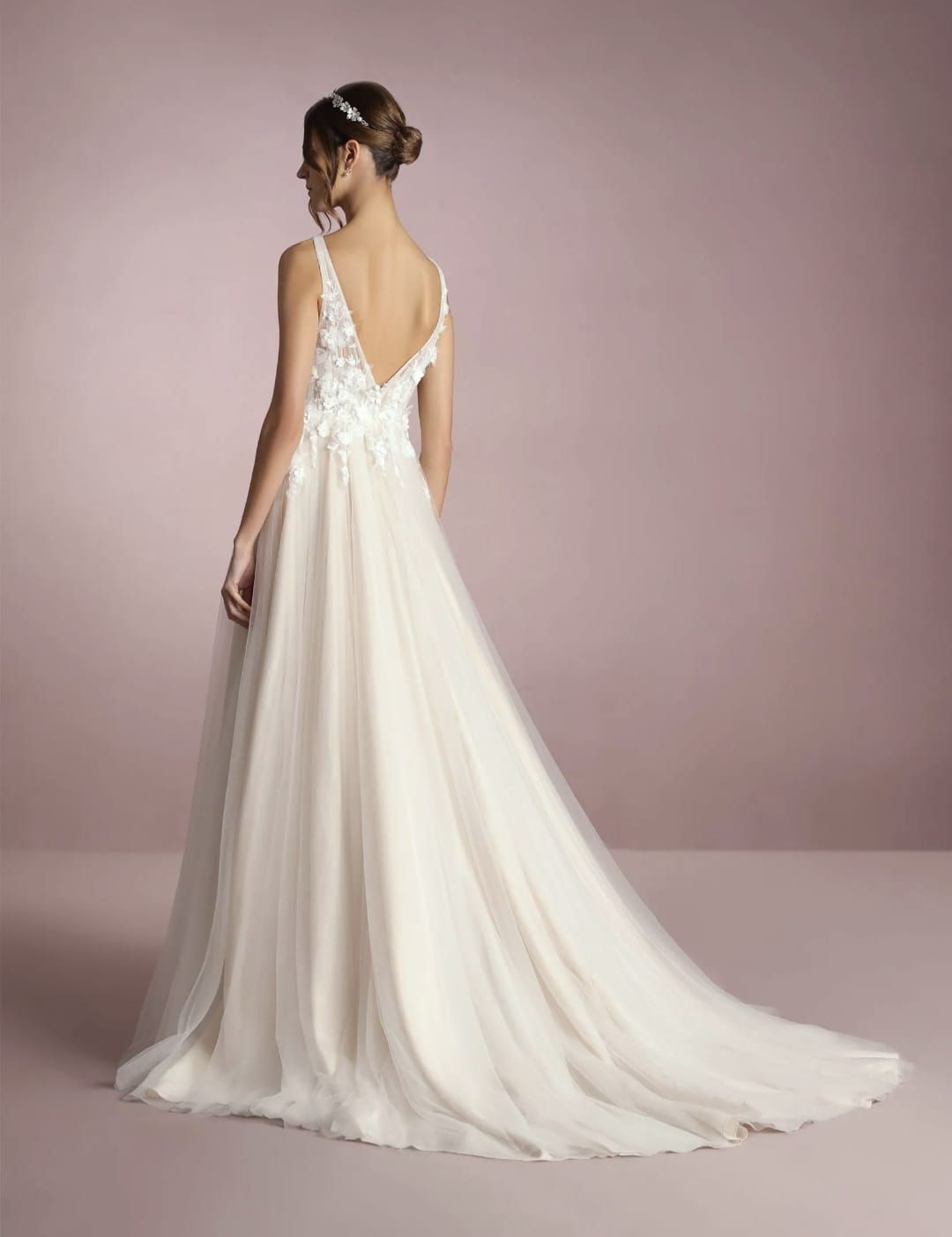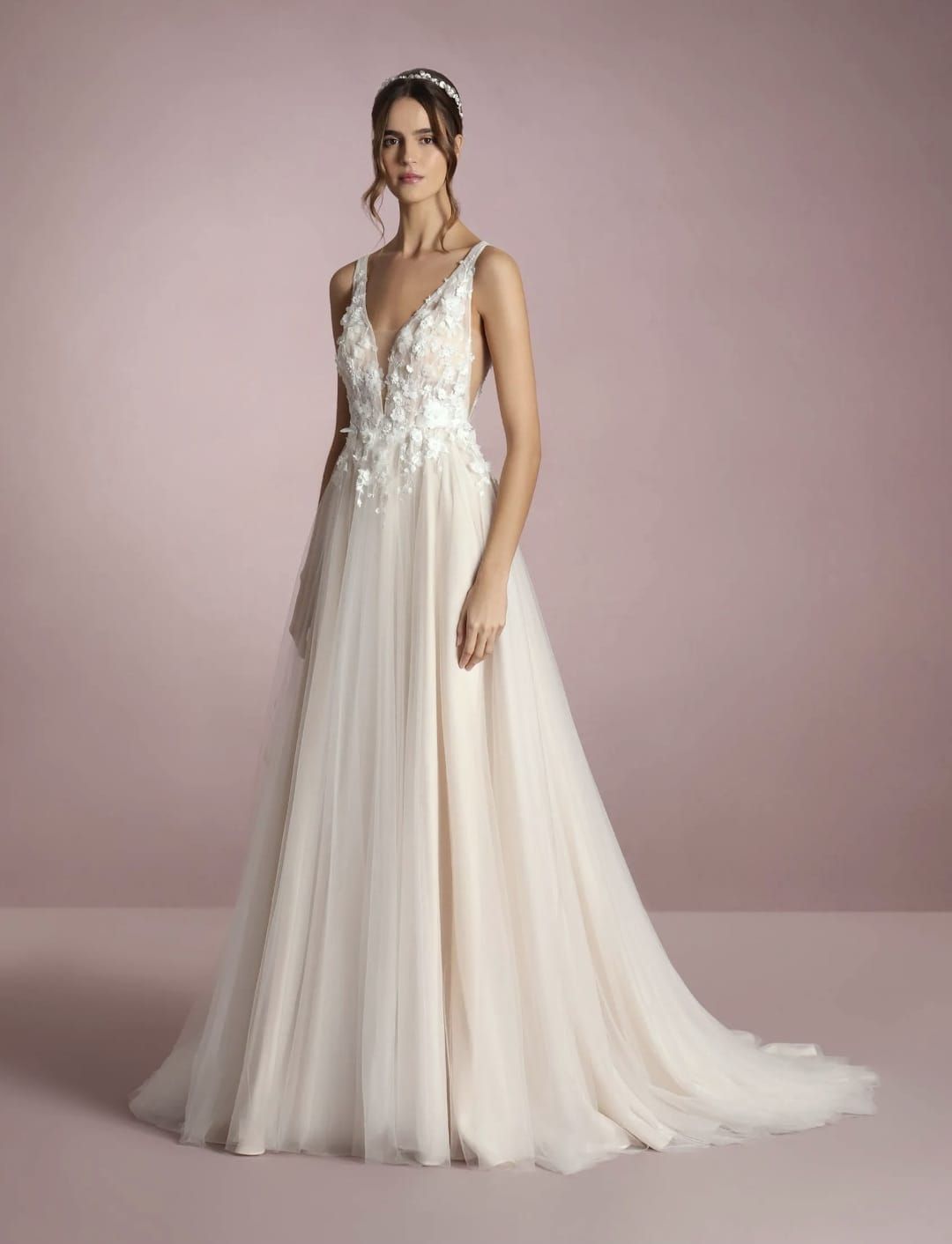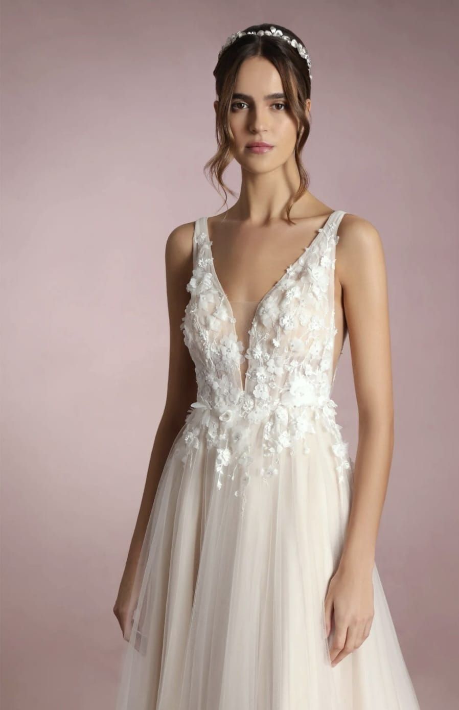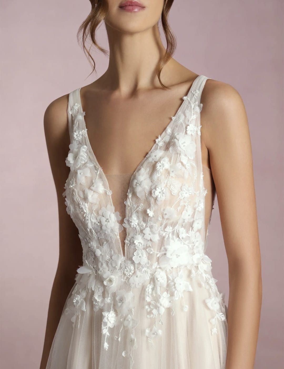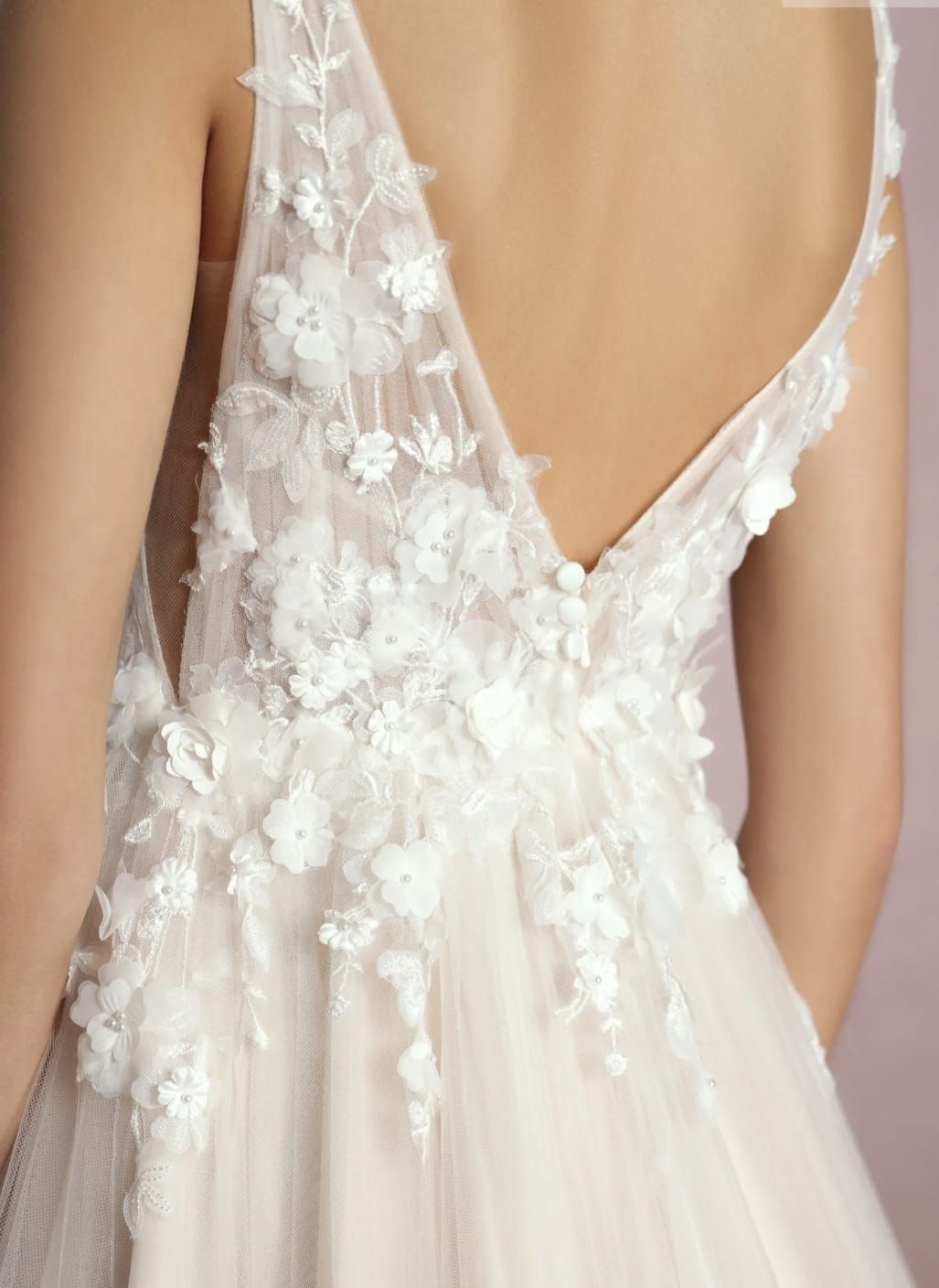 YUNA ist ein romantisches Kleid aus Tüll mit Spitzen- und Strassdetails am Mieder und an der Taille, einem tiefen V-Ausschnitt vorne und hinten und einem wunderschön fließenden Rock, der die Silhouette der Braut umschmeichelt und ihr ein schmeichelhaftes Finish verleiht. 2025 gekauft, leider nie getragen. Es ist ein Traumkleid, sehr fein und filigran, leicht, dreischichtig, schön blumig und wunderschön. Es gäbe auch einen passenden Schleier dazuzuerwerben. für 150€